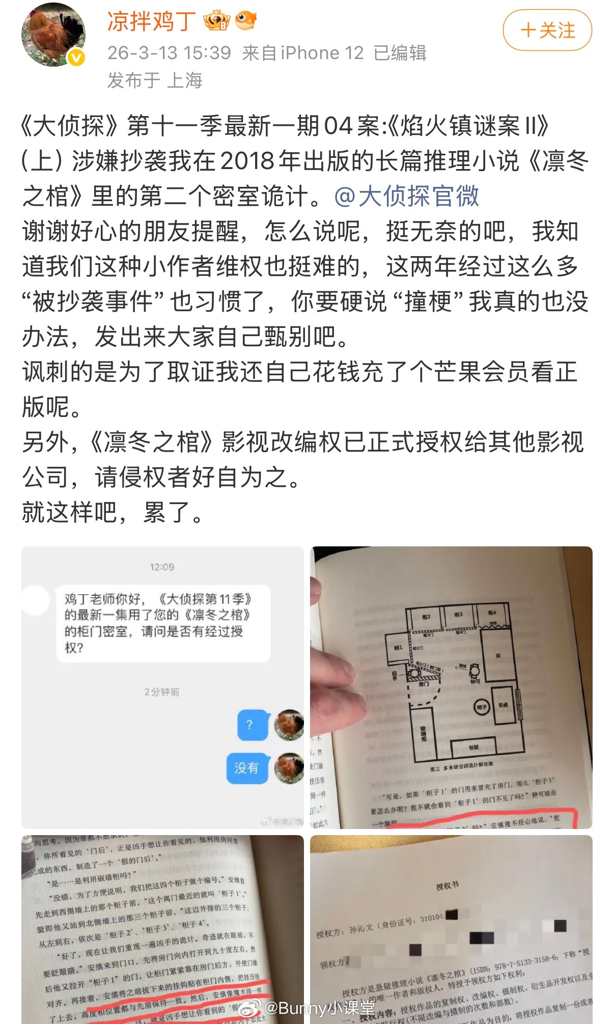 推理小说《凛冬之棺》作者发文称《大侦探》第十一季最新一期04案:《焰火镇谜案II》(上)涉嫌抄袭他的小说,并给出了细节对比,讽刺的是作者还得买芒果会员才能看到正版综艺。作者表示《凛冬之棺》影视改编权已正式授权给其他影视公司,请侵权者好自为之。