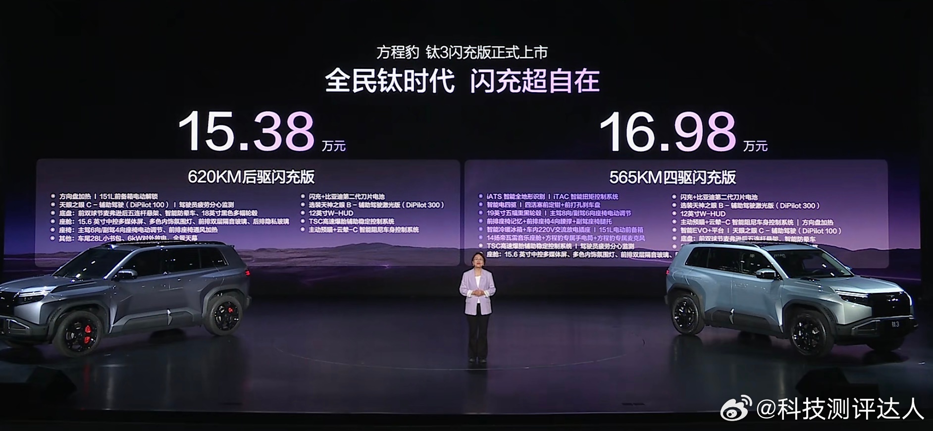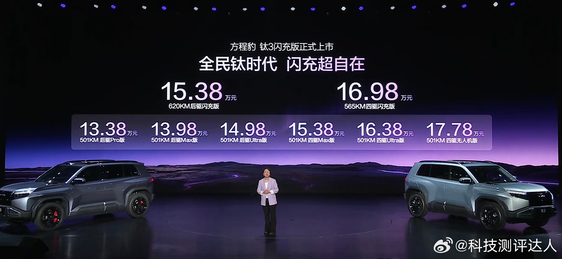 方程豹钛3闪充版价格来了!620KM后驱闪充版—15.38万565KM四驱闪充版—16.98万还有6大钛享好礼,不仅免费送一年闪充权益,还加多6个月,诚意满满另外钛7EV闪充版以22-25万的价格正式开启预订~比亚迪钛3闪充版上市发布会