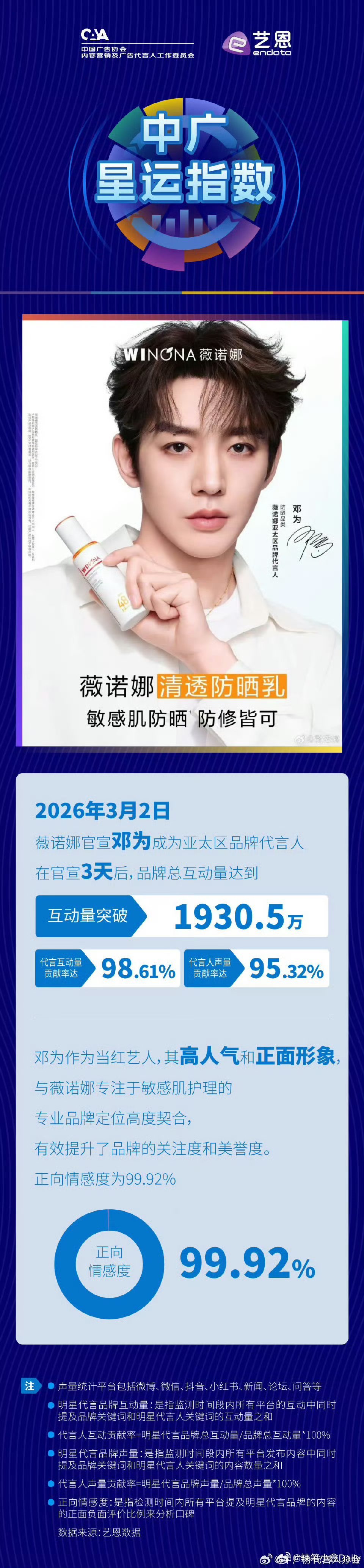 邓为的商业价值太🐮了,中广协发布的薇诺娜官宣代言指数,官宣三天总互动量破1930.50万,其中代言人声量贡献率为95.32%,代言互动量贡献率达98.61%,正向情感度为99.92%,邓为号召力和人气超级,高颜值+气质出众和品牌契合度💯,找邓为做品牌代言人,不仅粉丝氪金能力强,还很好的维护了品牌形象!