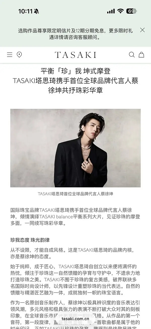 蔡徐坤外网官宣TASAKI塔思琦全球品牌代言人