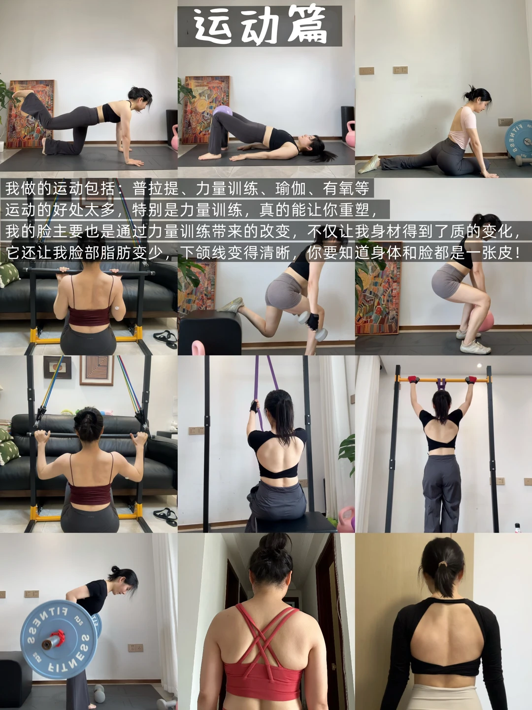 力量训练每周保持3-4练,两次肩背+两次臀腿! 不得不说力量训练真的是让我脱胎换骨的一项运动,不仅让我体态变好,脸部紧致,身体素质比以前好了很多。