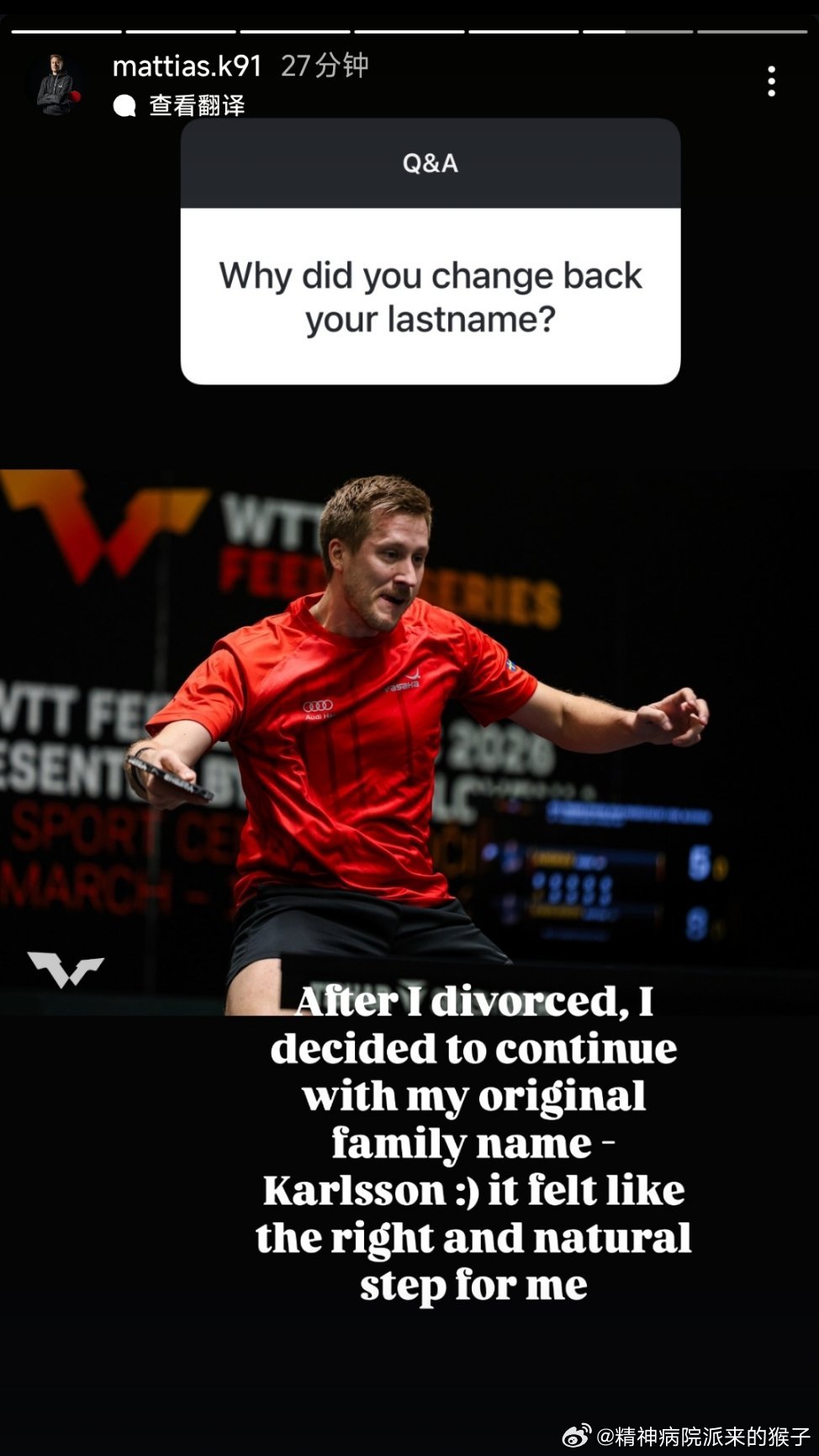马蒂亚斯在ins的Q&A回答了关于改回原名的问题问: 你为什么改回原来的姓氏?答: 离婚后,我决定改回原本的姓氏卡尔松(Karlsson)。对我来说,这是正确且自然的一步。