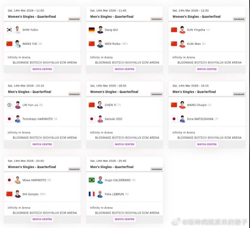 2026WTT重庆冠军赛第五比赛日赛程:3月14日 男女单打¼决赛11:00 女单:王艺迪🇨🇳VS申裕斌🇰🇷11:45 男单:温瑞博🇨🇳VS邱党🇩🇪12:30 女单:孙颖莎🇨🇳VS蒯曼🇨🇳13:15 男单:林昀儒(中国台北)VS张本智和🇯🇵18:30 女单:陈熠🇨🇳VS大藤沙月🇯🇵19:15 男单:王楚钦🇨🇳VS松岛辉空🇯🇵20:00 女单:石洵瑶🇨🇳VS张本美和🇯🇵20:45 男单:卡尔德拉诺🇧🇷VS菲利克斯勒布伦🇫🇷