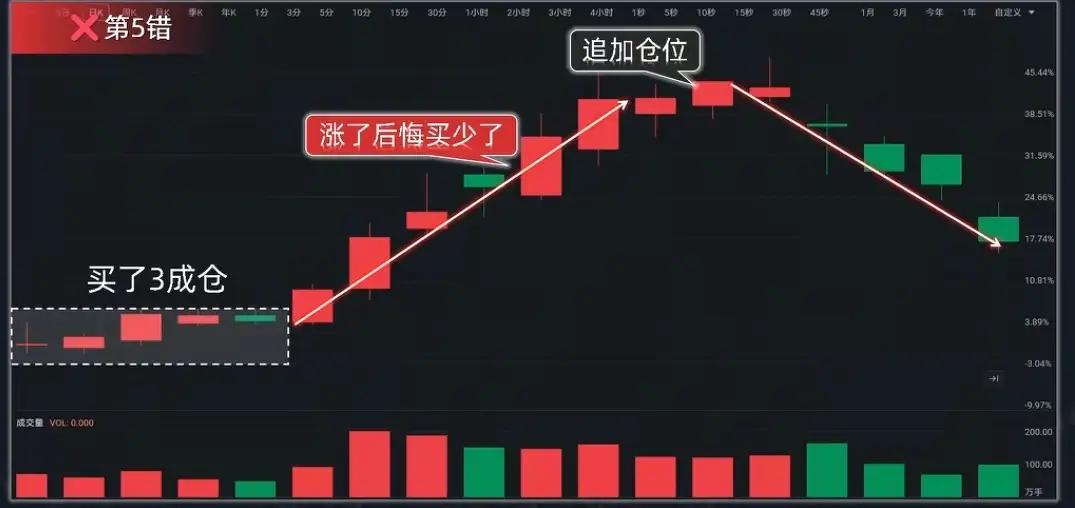 炒股“5连错”:散户亏光本金的闭环 A股散户常连踩五大错误致巨亏: 1. 高位不逃:见顶信号现仍幻想,利润回吐起点; 2. 下跌抄底:越跌越买,资金耗尽、心态崩溃; 3. 底部拿不住:小赚即跑,错失主升浪; 4. 卖飞追高:心态失衡高位接回,利润倒贴; 5. 涨后加仓:高位重仓,盈利变亏损。 本质是无纪律、情绪化、逆趋势。核心是少犯错、及时纠错:用纪律约束买卖,不情绪决策。市场不缺机会,缺不被人性左右的交易者。 (风险提示:内容仅供参考,不构成投资建议,股市有风险。)