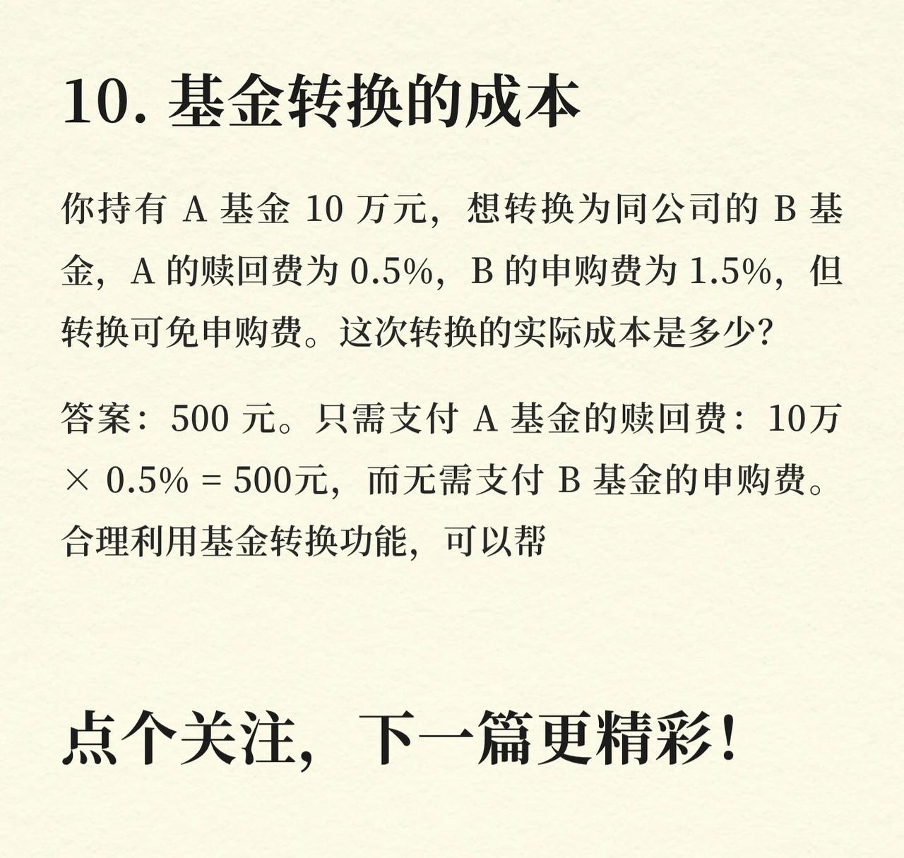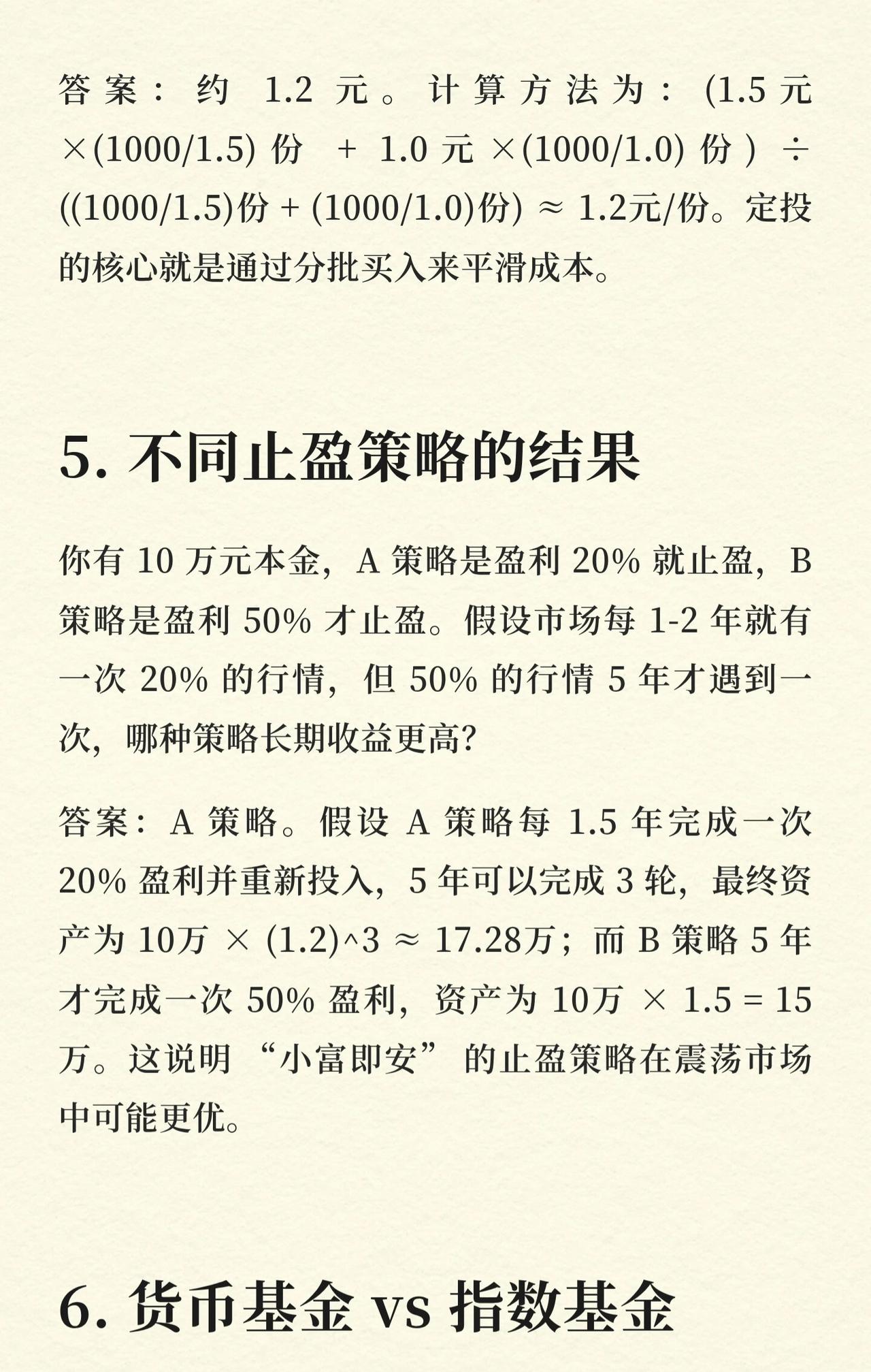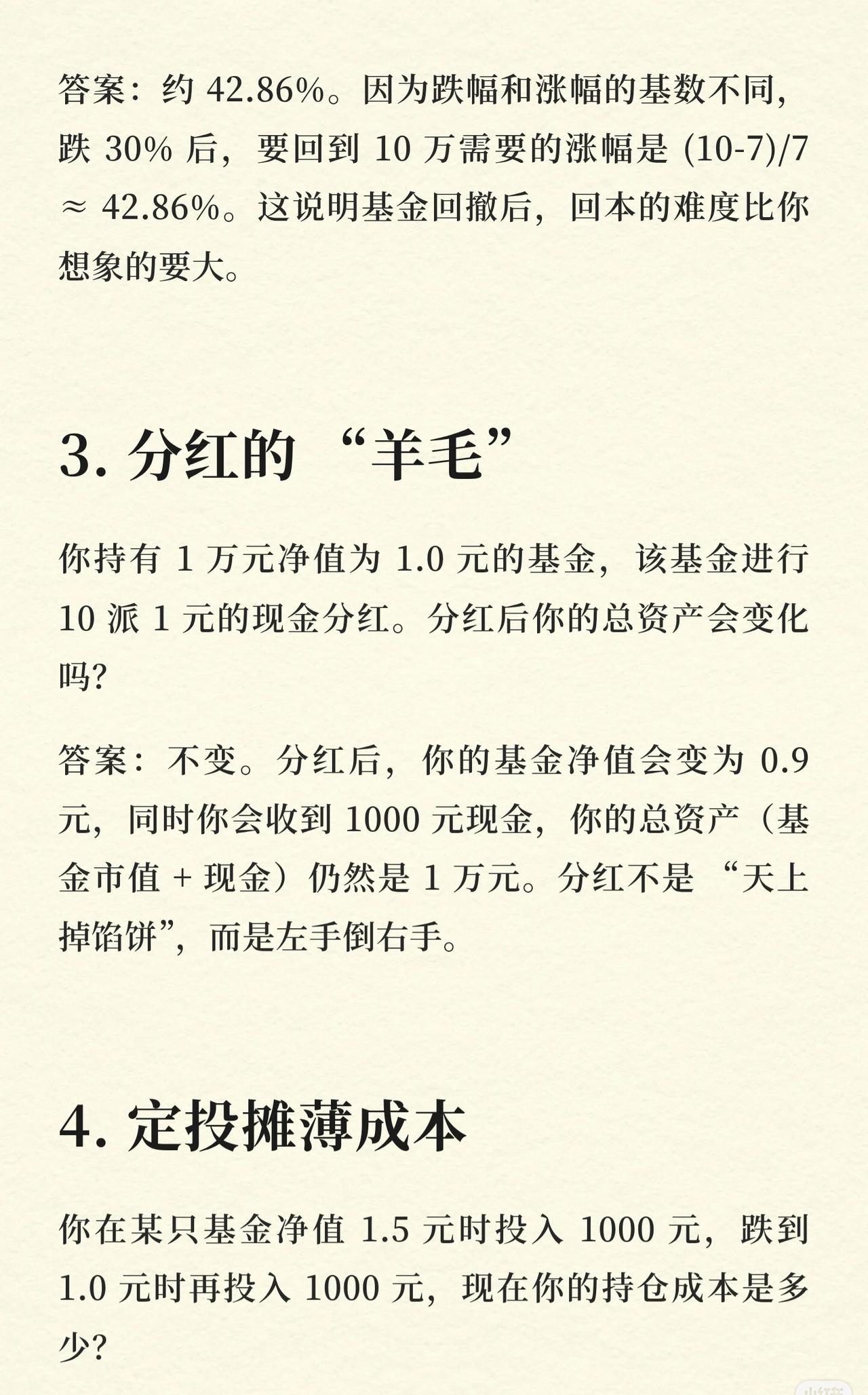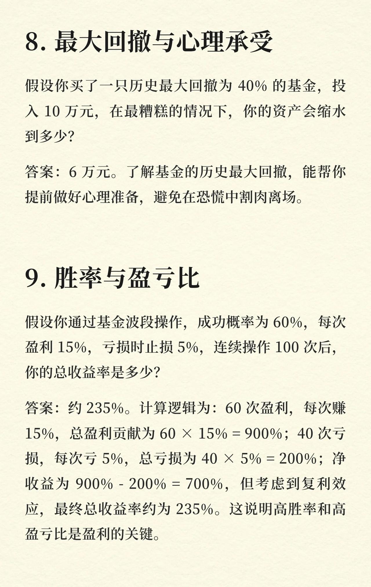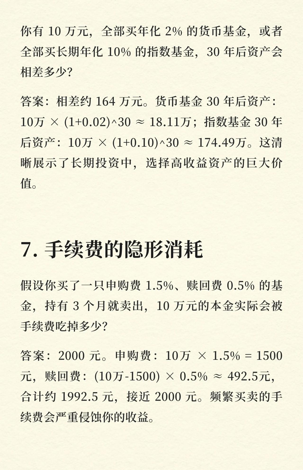 基金投资中10个关键账,帮投资者理清逻辑、避免误区: 1. 复利的魔力 每月定投1000元(年化12%),20年总资产约76.6万——长期定投+复利,时间是财富放大器。 2. 回撤与回本 10万基金跌30%剩7万,回本需涨约42.86%——回撤后回本难度远超下跌幅度。 3. 分红的“羊毛” 1万元净值1.0的基金,10派1现金分红后,总资产不变(净值变0.9+现金1000元)——分红是“左手倒右手”,非额外收益。 4. 定投摊薄成本 净值1.5、1.0时各投1000元,持仓成本约1.2元——分批买入平滑成本,降低波动影响。 5. 不同止盈策略的结果 10万本金,A(盈利20%止盈,1.5年一轮)vs B(盈利50%止盈,5年一轮)。5年后A资产≈17.28万,B≈15万——“小富即安”的止盈策略,震荡市更优。 6. 货币基金vs指数基金 10万分别买年化2%货币、10%指数基金,30年后资产差约164万(货币≈18.11万,指数≈174.49万)——长期选高收益资产,差距悬殊。 7. 手续费的隐形消耗 10万买申购费1.5%、赎回费0.5%的基金,持有3个月卖出,手续费≈2000元——频繁买卖会严重侵蚀收益。 8. 最大回撤与心理承受 历史最大回撤40%的基金,10万最坏情况缩水到6万——了解回撤,提前做好心理准备,避免恐慌割肉。 9. 胜率与盈亏比 波段操作(胜率60%,盈利15%、亏损5%),100次后总收益率约235%——高胜率+高盈亏比,是盈利核心。 10. 基金转换的成本 A基金10万转B基金,A赎回费0.5%(500元),B申购费1.5%(转换免)——合理转换可节省申购费,成本为A的赎回费。 核心逻辑:用数据和案例讲透基金投资的关键细节(复利、回撤、分红、定投、止盈、资产选择、手续费、心理承受、胜率盈亏比、转换成本),帮投资者建立理性投资认知。