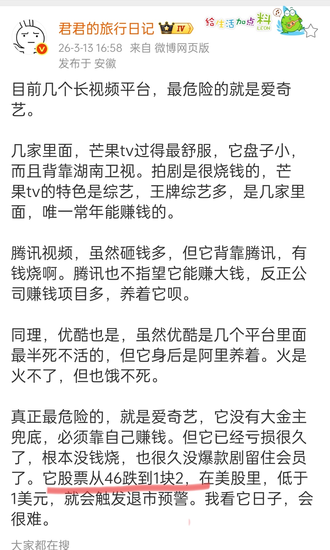 爱奇艺的股票从46块跌到了1.2元???