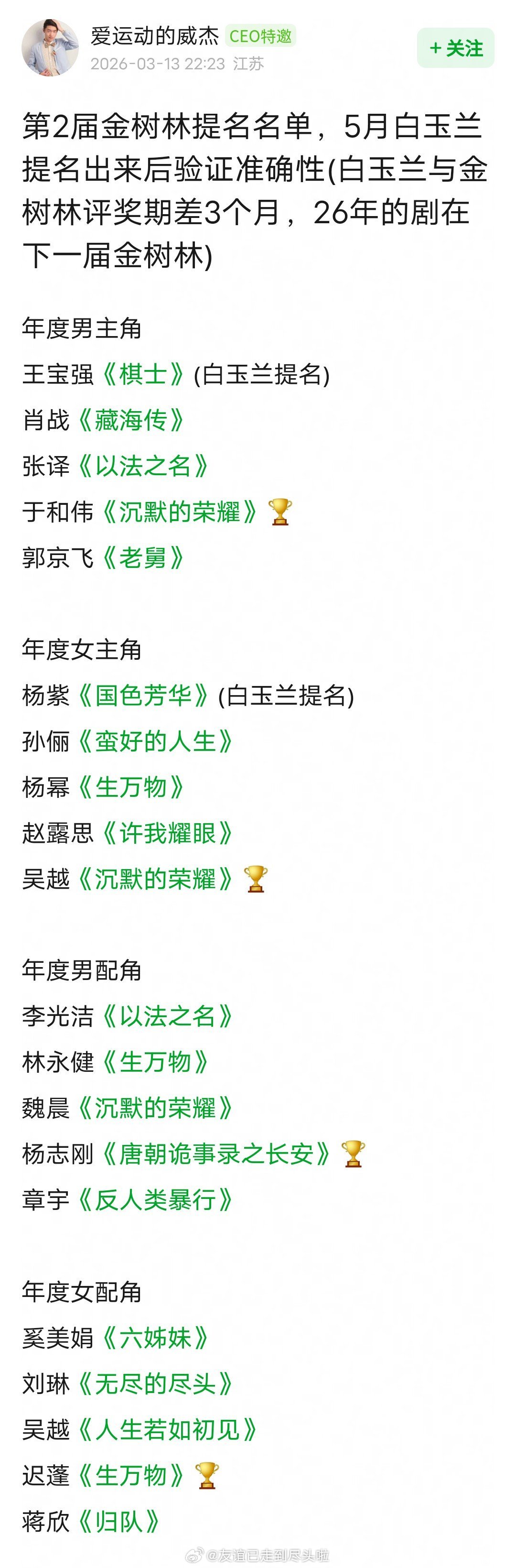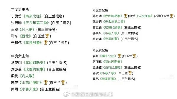 金树林年度男/女主角提名名单,感觉这就是今年白玉兰的提名名单了,不过杨紫会以《生命树》提名,赵露思也拿到了提名。男演员于和伟肖战,女演员孙俪杨幂吴越,这几个必提,也是众望所归的白玉兰得奖大热门。2026白玉兰提名名单预测白玉兰视后大年 白玉兰