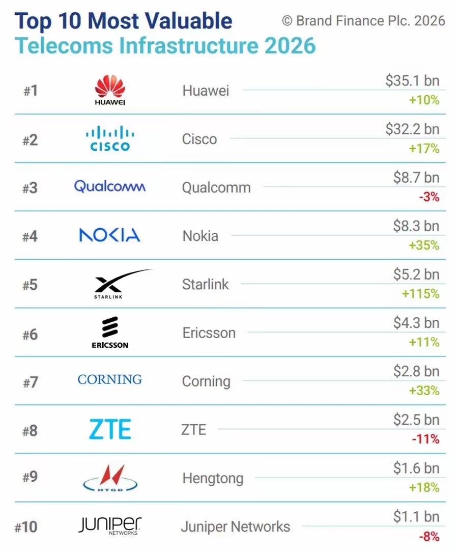 全球通信设备谁最强,华为高居榜首,值得一提的是还有两家国产公司上榜,商康宁公司和亨通光电