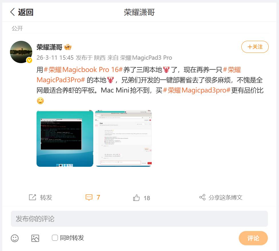 刚刚看到荣耀全场景产品线负责人潇哥,分享了荣耀MagicPad3 Pro,在Linux环境下部署的小龙虾,刚刚看了荣耀一键部署视频,得益于Linux良好的开发环境,安装可以说是一键完成,选择起来按照视频也是较为方便的,虽然看着复杂,但是关键点就那几个,学习过程慢慢积累吧 畅聊数码新品 数码资讯