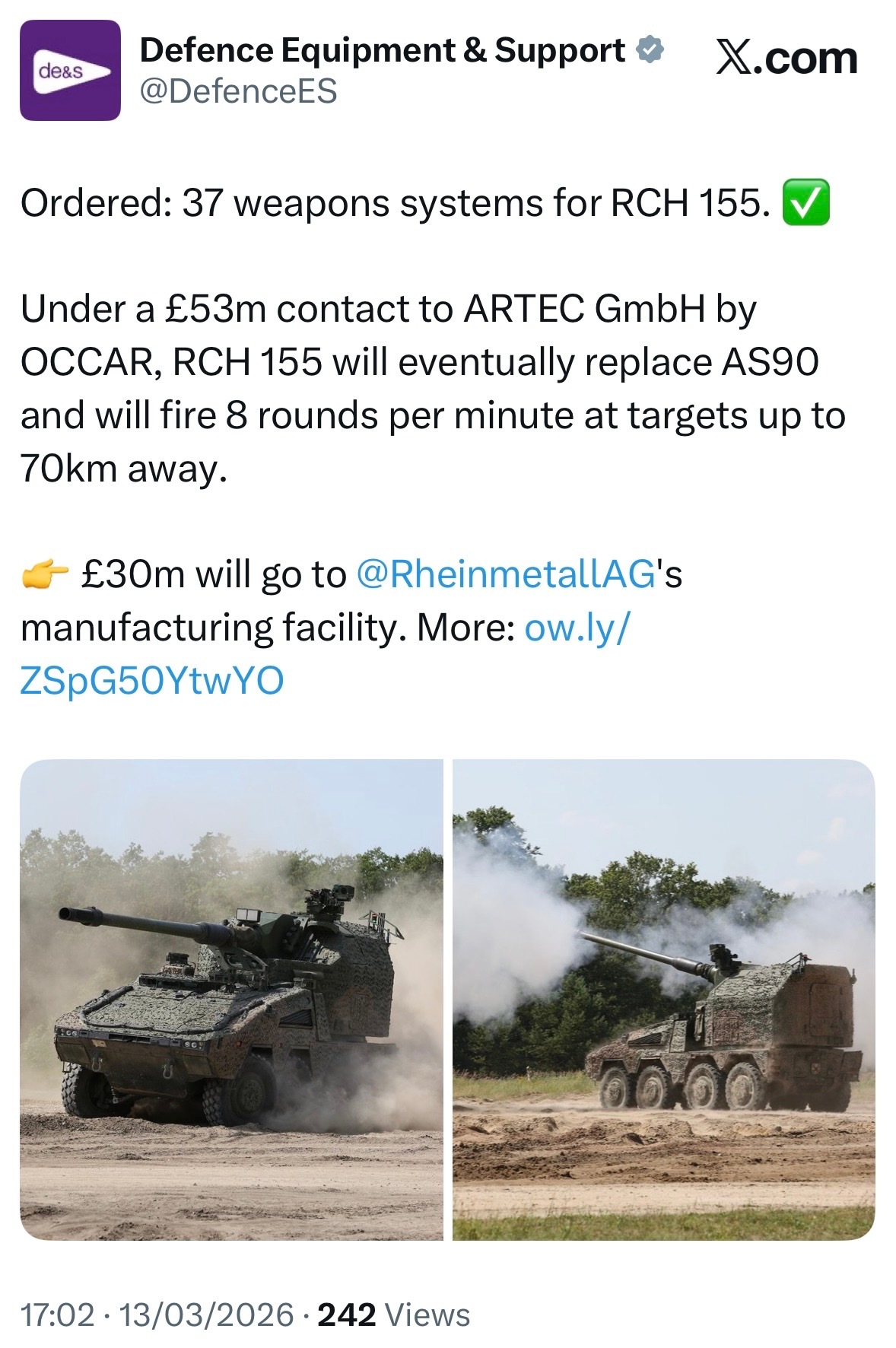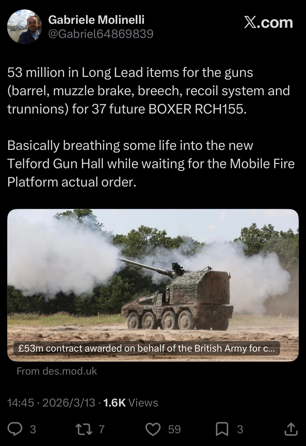 烽火问鼎计划 每天认识一件兵器 关于英国🇬🇧采购Boxer RCH 155自行火炮(图1,图2),所以英国🇬🇧国防部支付的53,000,000英镑💷是包含了37个RCH 155炮塔的长周期零部件的,而且其中的30,000,000英镑💷是直接投给莱茵金属的生产工厂的。