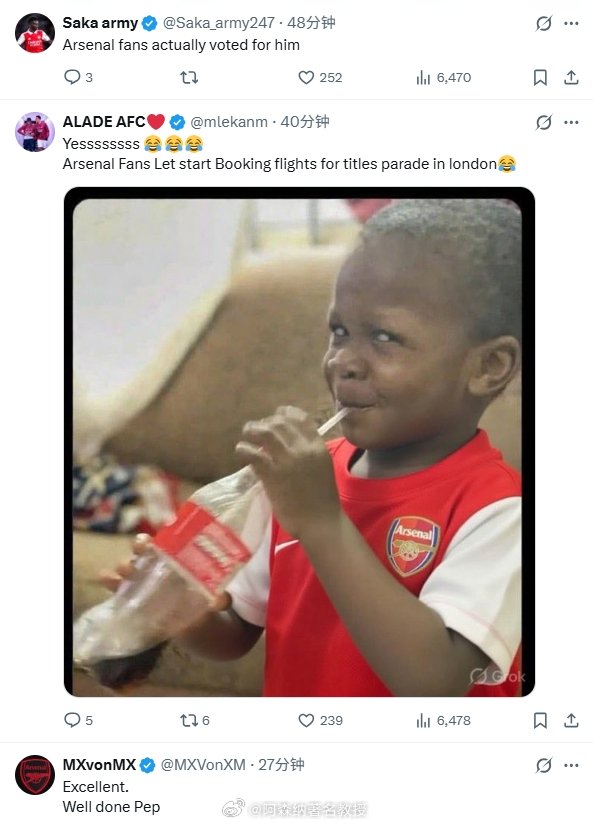 英超官方评论区节选:“阿森纳球迷都投他的”“好耶!枪迷们伦敦夺冠游行机票开始订起来😂😂😂”“妙极了,干得漂亮佩普。”“热烈祝贺佩普,你绝对配得上这个奖👏👏👏👏 现在我们的夺冠征程继续。”“曼城崩盘本周开始,我们等着看。”“让诅咒降临吧🥹”“诅咒明天开启,西汉姆联有什么好戏都使出来吧。”“热烈祝贺佩普得奖,现在轮到给阿尔特塔准备赛季最佳主教练奖了。” 英超联赛 阿森纳著名教授
