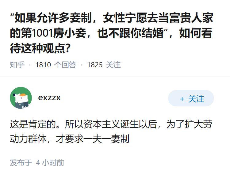 “如果允许多妾制,女性宁愿去当富贵人家的第1001房小妾,也不跟你结婚”,如何看