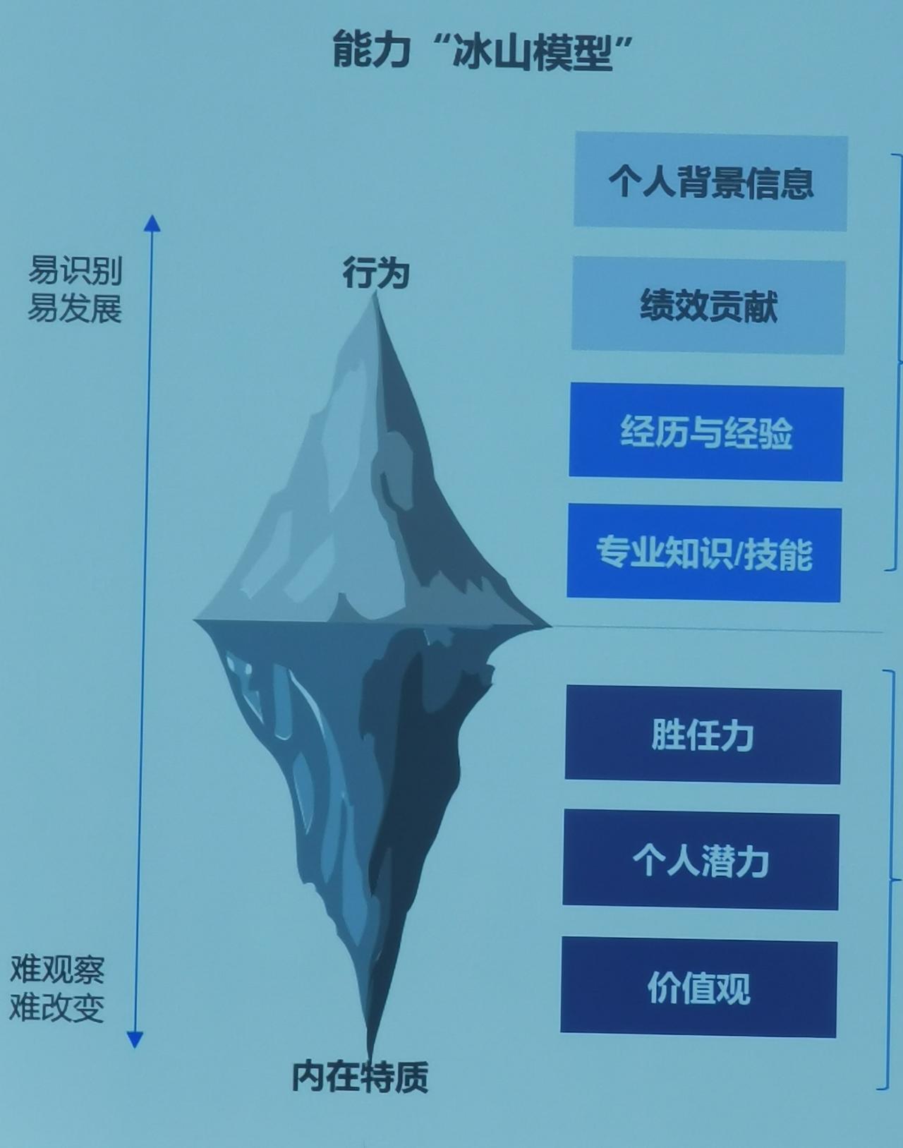 个人能力的冰山模型。一个人的日常生活工作行为是容易识别,也是容易发展的。但是,真正决定一个人的却是难以观察难以改变的内外特质。它包括个人的能力,价值观和胜任力,这些才决定你走多远走多高。