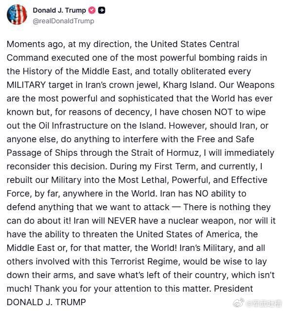 懂王:"几分钟前,根据我的命令,美国中央司令部对伊朗明珠﹣﹣哈尔克岛﹣﹣进行了中东历史上威力最强大的轰炸之一,彻底摧毁了岛上所有军事目标。出于道义考虑,我决定不摧毁岛上的石油基础设施。但是,如果伊朗或其他任何国家采取任何阻碍船只自由安全通过霍尔木兹海峡的行动,我将立即重新考虑这一决定。伊朗军方以及所有与这个恐怖政权有关联的人最好放下武器,保住他们所剩无几的国家!"结合美国将海军陆战队远征大队部署到中央司令部,美国极有可能会对哈尔克岛等波斯湾岛屿进行两栖登陆,以求控制霍尔木兹海峡,不过即便控制了该岛,我认为也解封不了霍尔木兹海峡,甚至会成为伊朗导弹和无人机的近距离活靶子,希望懂王赶紧下命令,我要吃席!伊朗30枚超重导弹袭击以色列伊朗发起第45波打击美伊以冲突