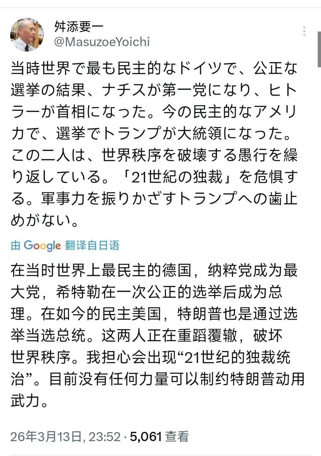 昨晚,日本前东京都知事、前厚生劳动省大臣舛添要一写道:“在当时世界上最民主的德国,经公正选举,纳粹成为第一大党,希特勒就任首相。如今在标榜民主的美国,特朗普也通过选举当选总统。这两人正重蹈覆辙,做出破坏世界秩序的蠢事。我担心会出现‘21世纪的独裁统治’。目前没有任何力量可以制约特朗普动用武力。” [机智]民主外衣下的霸权警钟!日本前高官舛添要一的警示绝非危言耸听,历史与现实的对照令人深思。当年纳粹借合法选举上位,靠民粹煽动撕裂社会,最终将世界拖入战火;如今美式民主沦为利益博弈工具,强人政治借选举上台,单边主义肆意冲击全球规则。当下国际局势动荡,军事威慑被频繁用作外交筹码,多边机制被不断弱化,缺乏有效制衡的强权极易突破底线。历史教训告诉我们,民主一旦被野心裹挟,就会成为破坏秩序的工具。 当今世界最需要的是规则与制衡,而非单边霸权。唯有坚守多边主义,强化国际协作,才能避免历史悲剧重演,守护全球和平稳定。