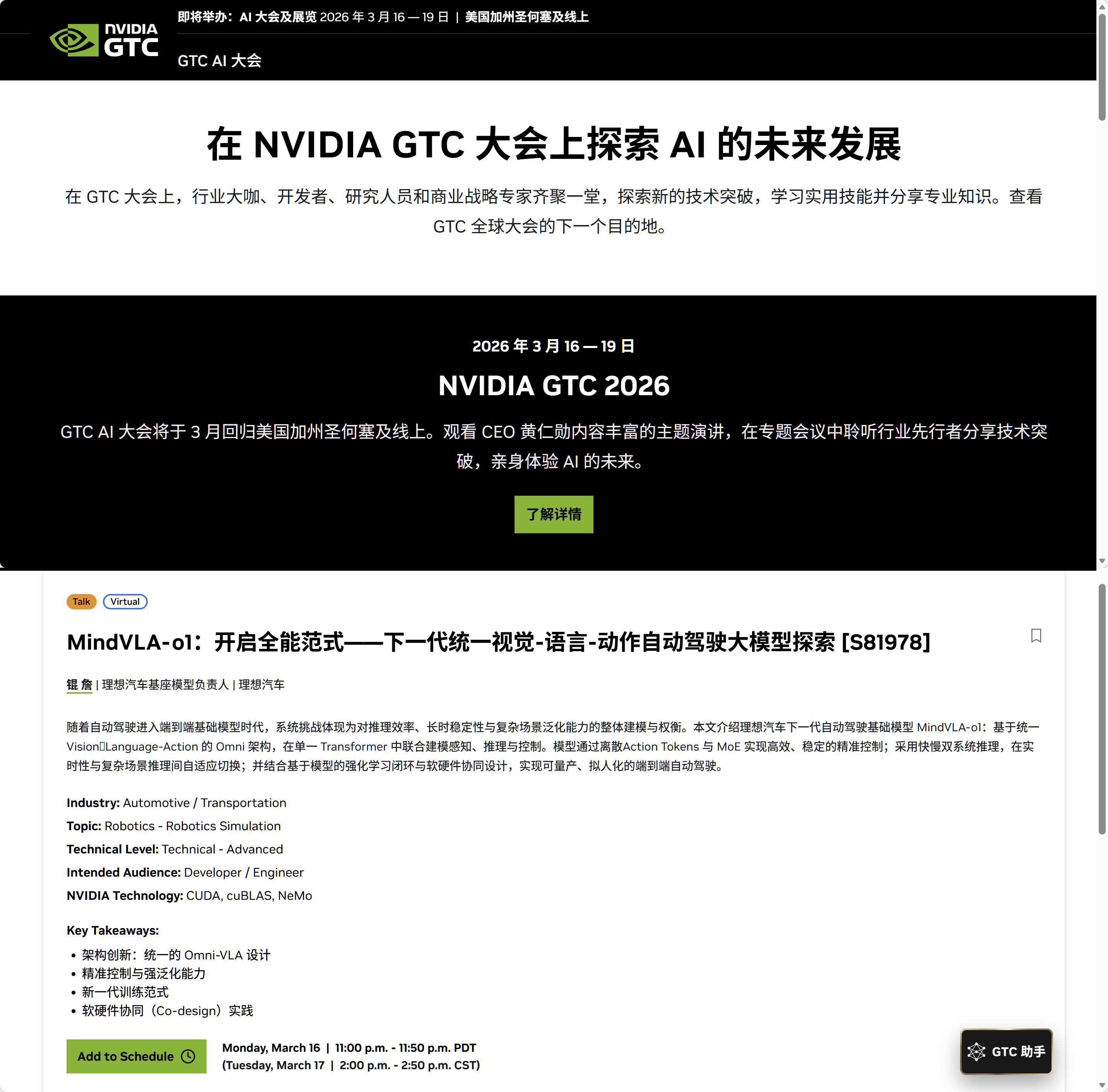 英伟达的GTC大会将在3月16-19日(美国圣何塞)举行,大会期间,理想汽车VLA基座模型负责人詹锟将在大会发表“新一代VLA模型”的主题分享。