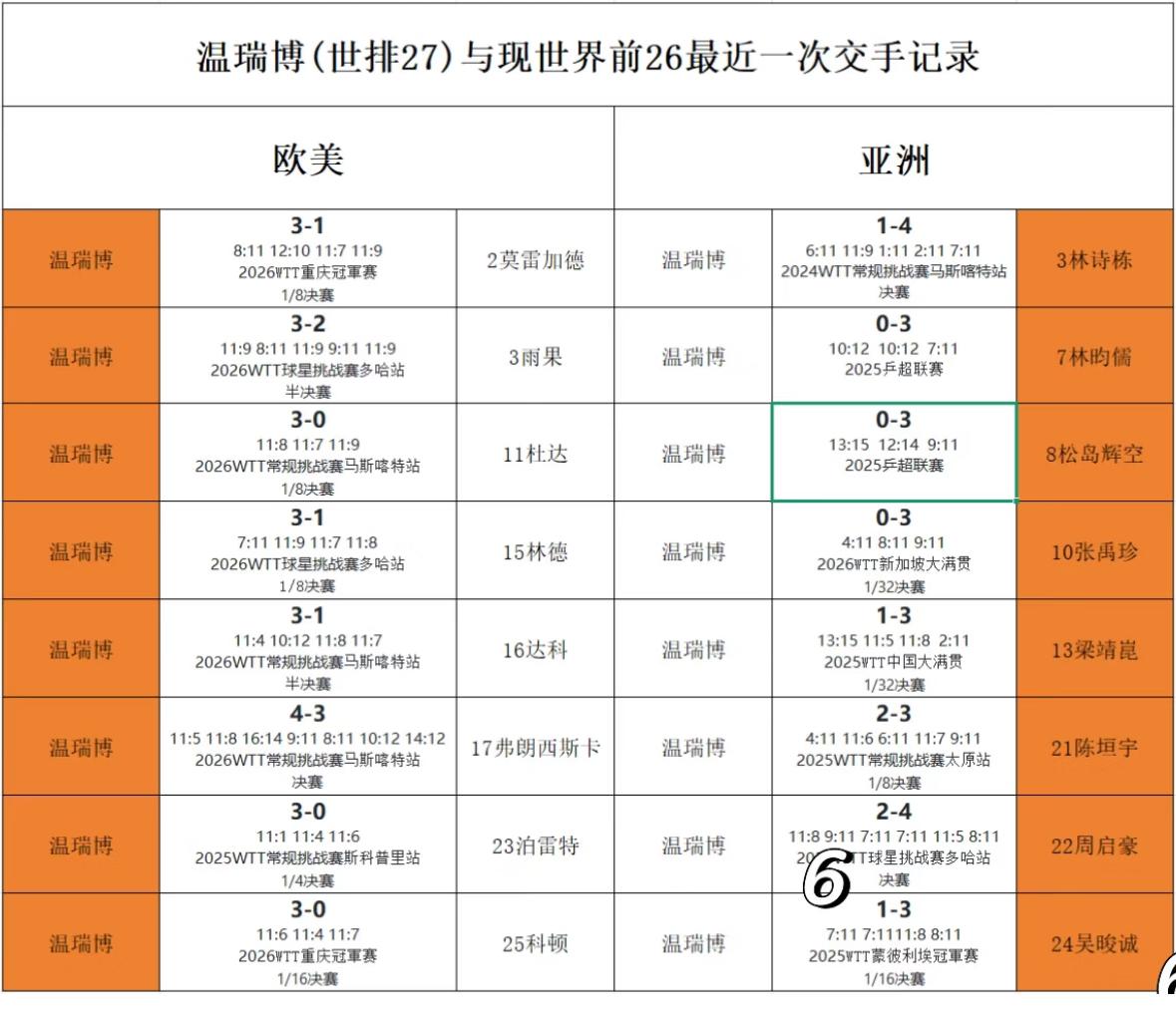 温瑞博与亚洲及欧洲选手的头对头全记录——重庆冠军赛温瑞博的输赢取决于邱党是欧洲还是亚洲选手啊! 温瑞博对欧洲选手的全胜纪录, 但小温对亚洲选手全负的战绩 成为鲜明的对比, 这已经不是概率可以判断的了, 邱党以欧洲选手的身份参赛, 小将温瑞博一定可以保持战绩! 所以说邱党是欧洲还是亚洲 这就是关键点, 邱党是亚裔,打法兼具亚洲和欧洲 的特点, 温瑞博的台内球很粗糙, 前三板进步了很多, 打相持球不错👍, 但是亚洲选手大多都是前三板 和台内球。 温瑞博这几个月涨球厉害👍, 相信温瑞博今天打邱党没问题, 上午11:45,温瑞博VS邱党, 相信教练组一定制定出适合的 技战术,而且小温执行力很强, 温瑞博加油!