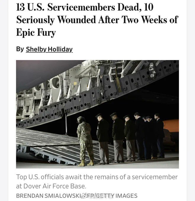 a股 据《华尔街日报》报道,美伊冲突两周以来,美军伤亡情况如下:13名美军士兵阵亡,10人重伤,受伤总人数约200人,其中约170人已返回岗位执行任务。