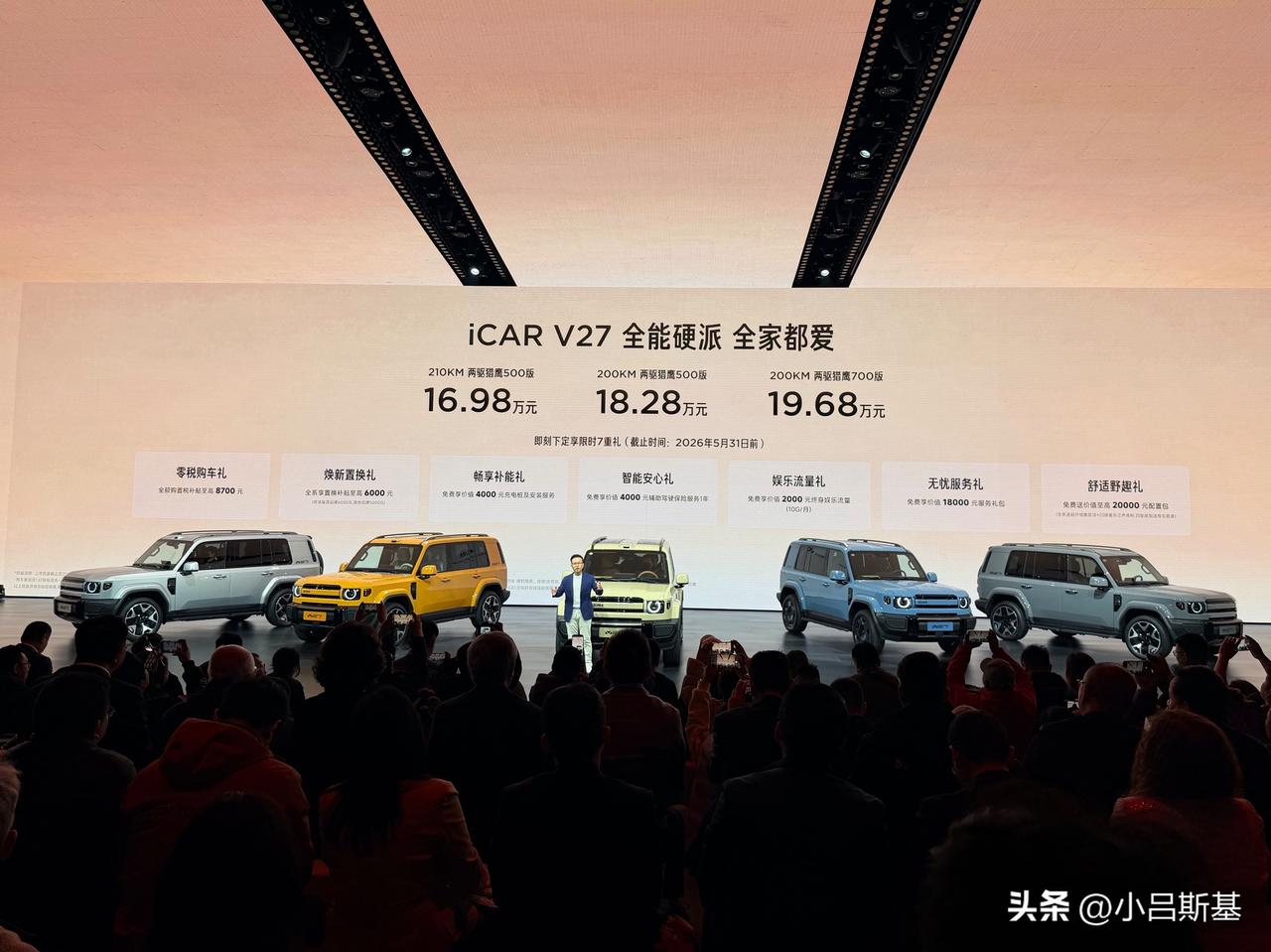最近这几个月,很多网友问我iCAR V27这车,包括问啥时候上市、估计得多少钱、综合素质能不能赶得上钛7等等。 今天这车也正式上市了,16.98万起,标配34.3度电池,所以续航和钛7拉平的情况下要便宜2万。在尺寸、配置比较接近的情况下,性价比还是有一些的。 我看很多网友说就想要V27、钛7这种产品叫“越野风味”产品,方盒子外观既有一定个性彰显,并且整车的设定又很温馨家用。所以从市场需求来看,V27还是能卖得不错。