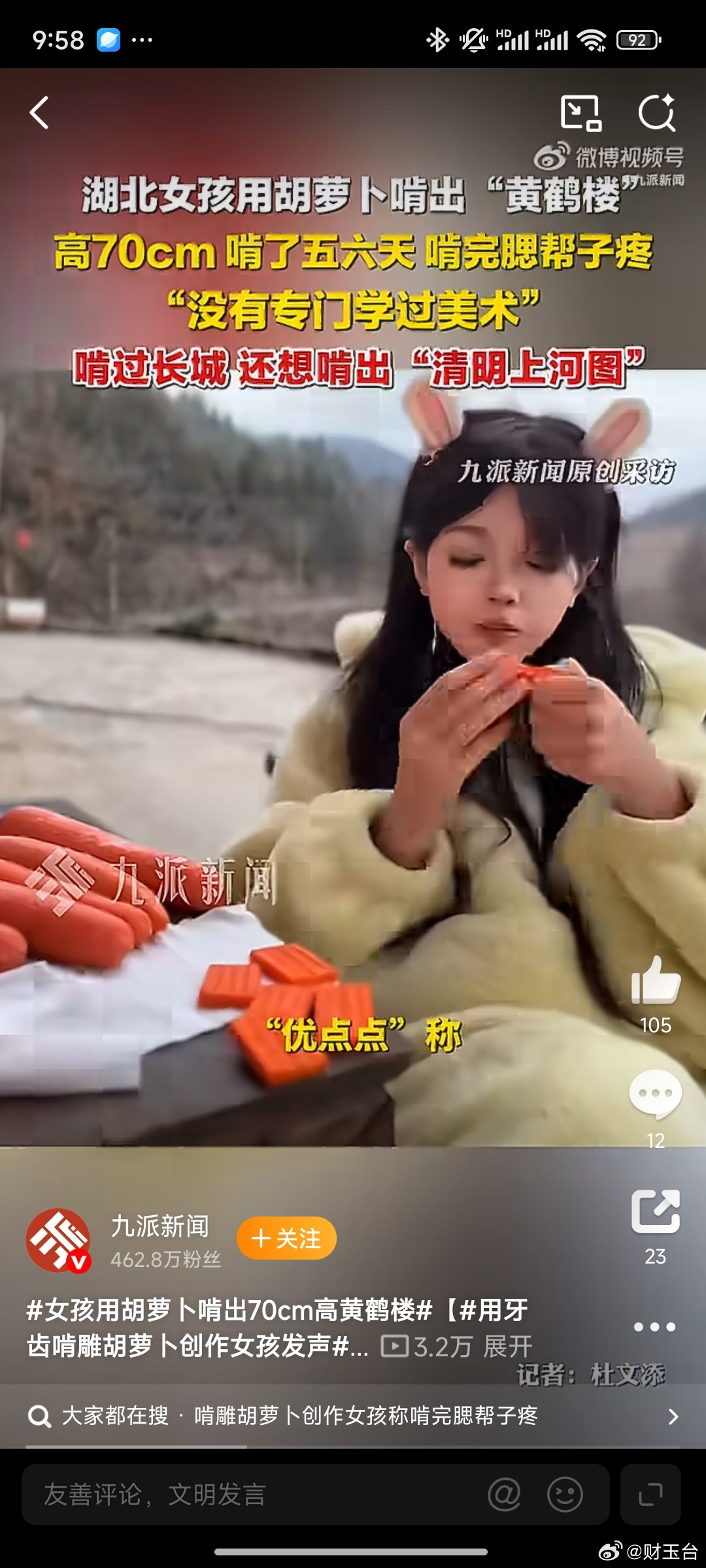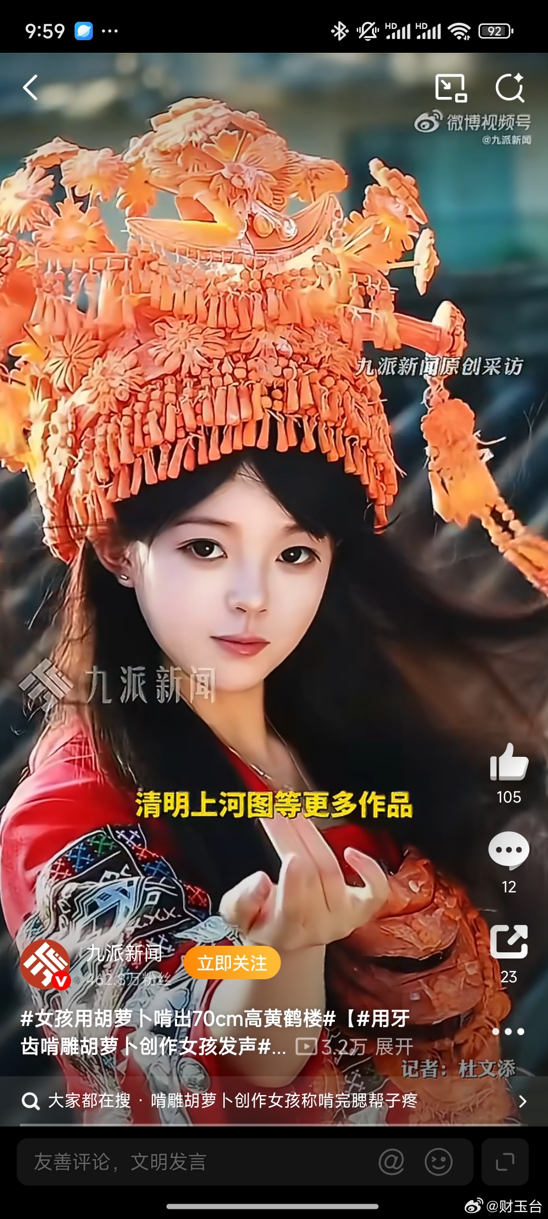 女孩用胡萝卜啃出70cm高黄鹤楼这也太绝了!一把普普通通的胡萝卜,愣是被啃出70cm高的黄鹤楼,飞檐翘角、层叠楼阁都栩栩如生,细节拉满,国风韵味十足。这哪里是啃萝卜,分明是藏在民间的艺术大神,用耐心和巧思把平凡食材变成惊艳佳作,创意和手艺双在线,真的太有才、太震撼了!