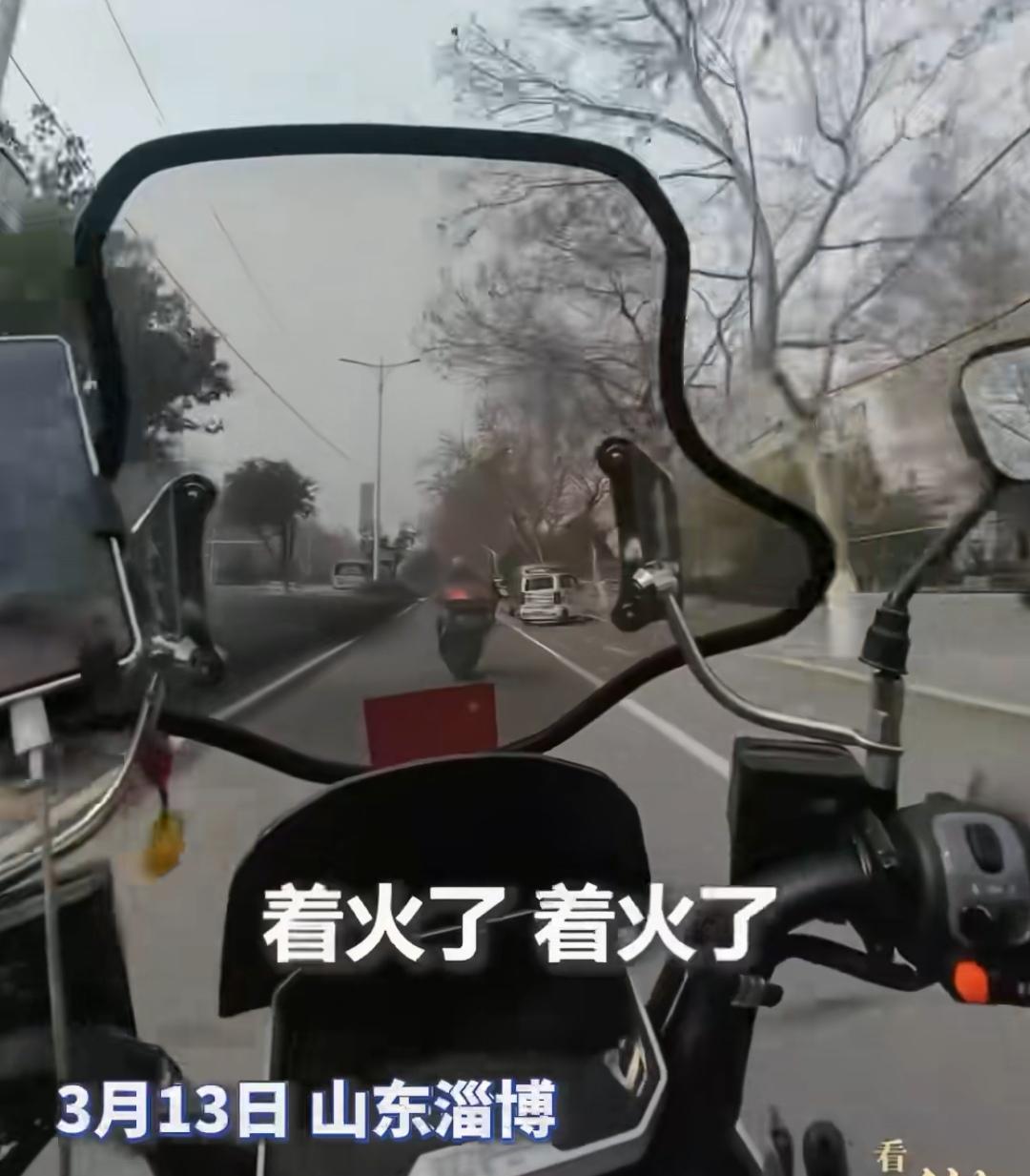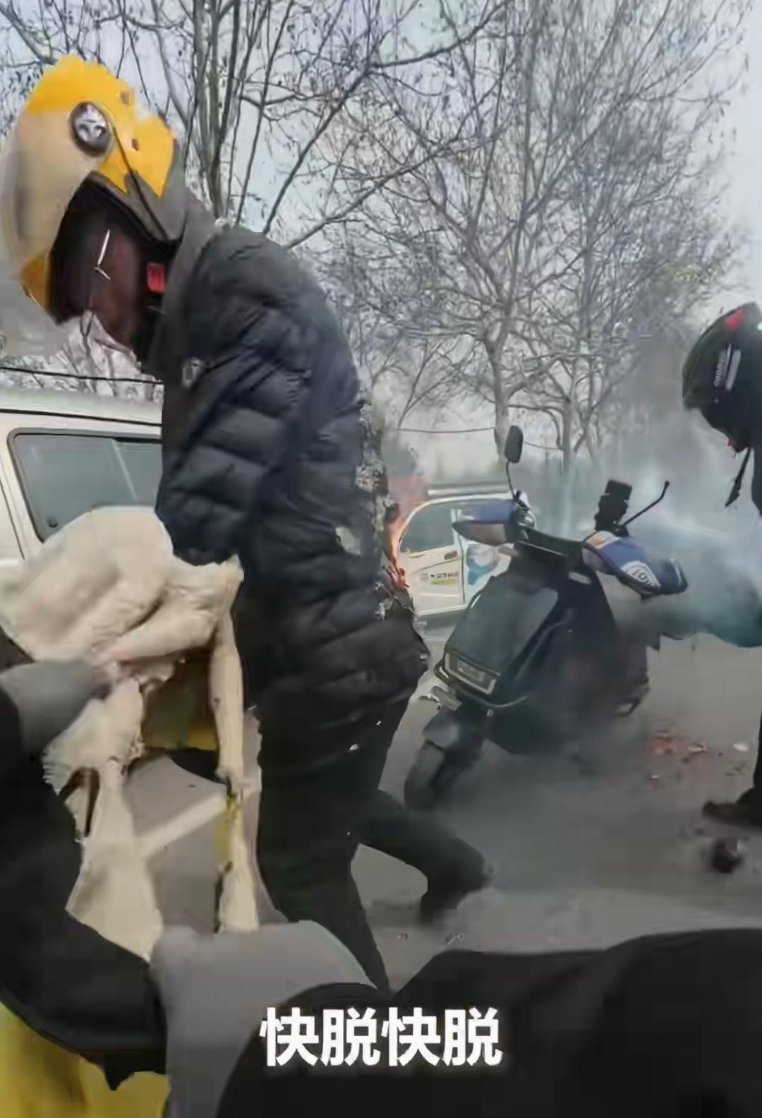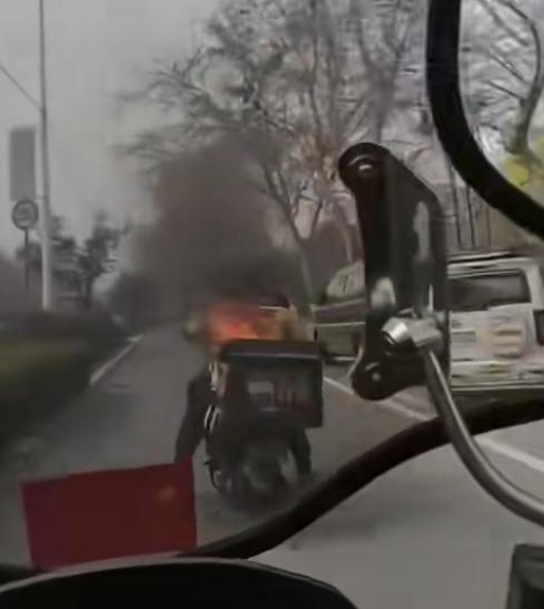 电动车骑着骑着着火了! 看图片里显示,一名外卖骑手在行驶过程中,电动车突然起火,多亏后面骑手提醒,并帮助灭火,没有大碍。 但是,需要引起重视的是,电动车🛵都应该引以为戒,随时注意自身的安全!