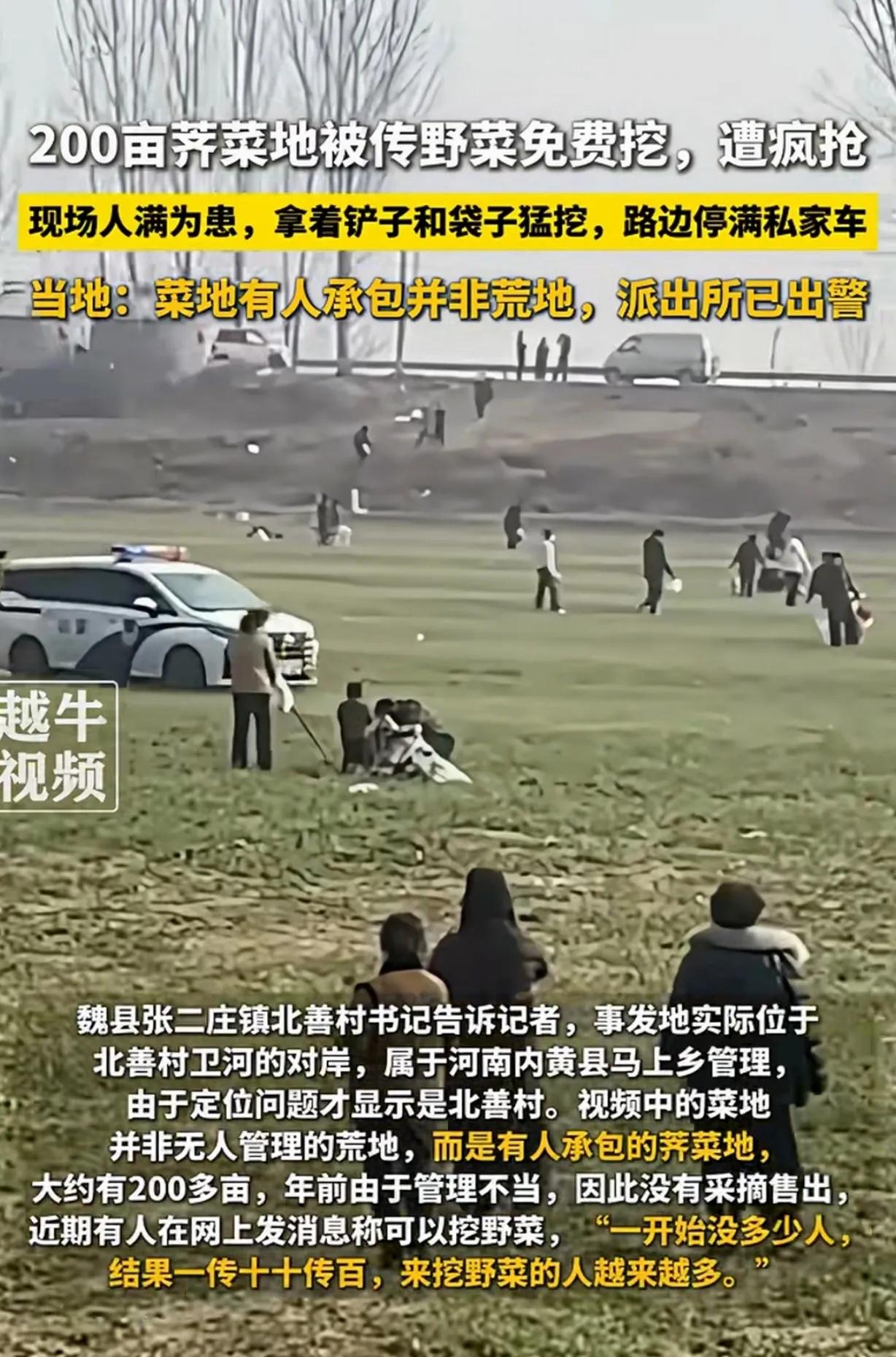 “太坏了!几万人冲到我家地里挖荠菜,200亩全毁了!”河南农户当场崩溃,造谣者一句话,谁来买单? 你能想象这样的场景吗?自己辛辛苦苦种了大半年的地,眼瞅着就要收获了,结果一夜之间,地里涌进来几万人,拿着铲子、背着麻袋,像蝗虫过境一样把地里挖得干干净净。这不是电影,这是前几天发生在河南内黄县的真事。 这位农户大哥是个实在人,瞅准了荠菜的市场行情,咬咬牙承包了200多亩地,一门心思扑在这片地里。从播种到浇水,从施肥到除草,每天起早贪黑,手上磨出了茧子,皮肤晒得黝黑,就盼着荠菜长好了能卖个好价钱,让家里人过上好日子。地里的荠菜也确实争气,长得绿油油一片,看着就喜人。 可谁能想到,意外就这么毫无征兆地来了。 不知道是哪个“人才”,在网上发了个视频,说这片地里的荠菜是野生的,免费随便挖。这消息就跟长了翅膀似的,一传十、十传百,很快就传遍了四面八方。接下来的场景,说出来你可能都不信——几万人开着私家车,从周边县市蜂拥而至,大堤上、小路旁,密密麻麻停满了车,扬起的尘土遮天蔽日。 这些人下了车,拿着铲子、铁锹,有的还扛着编织袋,一头扎进地里就开始埋头猛挖。有人为了抢到更多的荠菜,甚至在地里推搡争吵起来。好好的菜地被踩得乱七八糟,没挖的荠菜被踩烂在地里,挖出来的也被争来抢去。 农户大哥得到消息赶到地里时,整个人都懵了。他站在地头,看着眼前黑压压的人群,扯着嗓子喊:“别挖了!这是我种的!不是野生的!”可他那点声音,早被人群的喧嚣淹没。他冲进地里想拦,可这么多人,拦得住这个拦不住那个,急得他眼泪都快下来了。 等警察赶到现场,好不容易把人群驱散,地里已经是一片狼藉。200多亩荠菜,被挖得七七八八,剩下的也被踩得不成样子。农户大哥蹲在地头,望着这片狼藉的土地,几个月的心血就这么没了,那种滋味,旁人根本体会不到。 更让人憋屈的是,那些挖了菜的人,因为人数太多,最后大多拍拍屁股走人了,留下的只有农户自己面对这烂摊子。 这事儿传到网上,网友们直接炸了锅。有人说,这些去挖菜的人真的不知道这是人家种的吗?都是庄稼人,地里长出来的东西是不是野生的,能分不清吗?说白了,就是揣着明白装糊涂,看着别人挖自己也不甘落后,最后就成了这场闹剧的参与者。 其实从法律角度来说,这事儿真不是“法不责众”就能糊弄过去的。《民法典》第1165条写得明明白白,只要侵害了别人的民事权益,造成损害,就得承担侵权责任。那些动手挖菜的人,甭管挖多挖少,都是实打实的侵权,该赔就得赔。至于那个造谣说“免费挖”的人,更是跑不了,他这一句话,直接导致农户遭受巨大损失,民事赔偿得他担着,行政拘留跑不掉,情节严重的话还可能涉嫌刑事犯罪。 说到底,这件事给所有人都提了个醒。网上的消息不能全信,看见“免费”俩字得多个心眼。更关键的是,无论什么时候,都要守住那条底线——别人的东西,不能动就是不能动。这事儿你怎么看?如果你是那位农户,面对几万人来挖你的地,你会怎么办?欢迎在评论区聊聊。