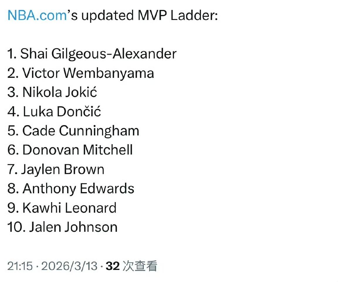 NBA官网更新MVP榜,亚历山大继续第一! NBA.com 更新的MVP榜单: 1. 谢伊·吉尔杰斯-亚历山大 2. 维克托·文班亚马 3. 尼古拉·约基奇 4. 卢卡·东契奇 5. 凯德·坎宁安 6. 多诺万·米切尔 7. 杰伦·布朗 8. 安东尼·爱德华兹 9. 科怀·伦纳德 10. 杰伦·约翰逊