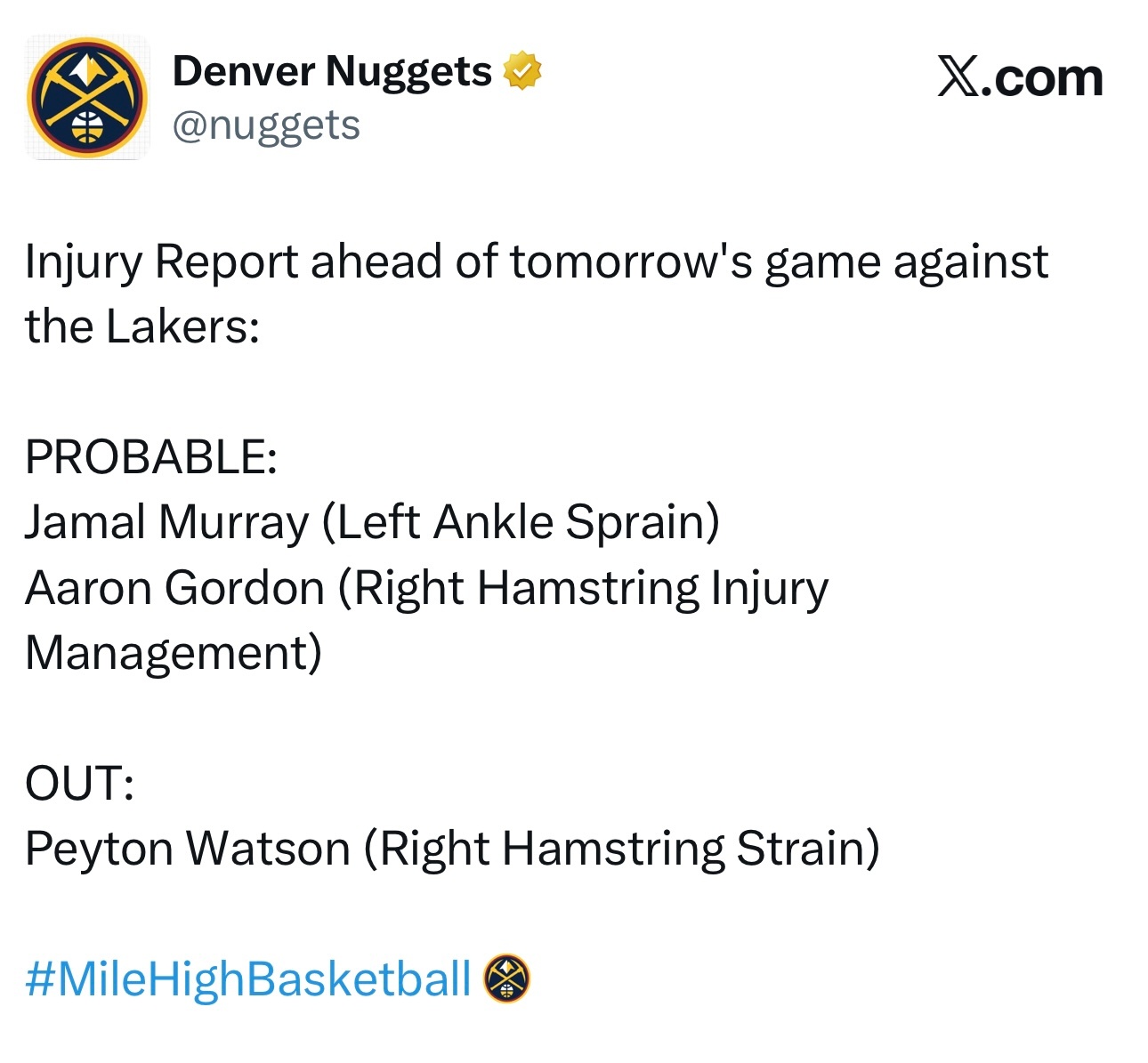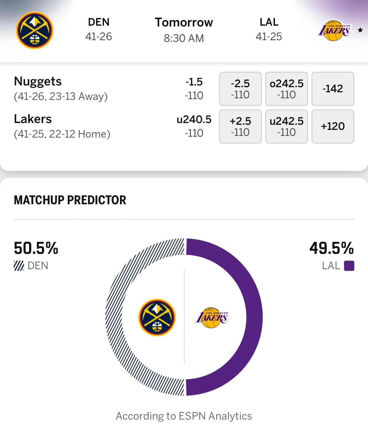 明天早上8点半,湖人主场对阵掘金!本赛季前两次交手,双方各胜一场!目前湖人西部第四,掘金西部第五,两队相差仅仅半个胜场的距离,几乎都能全主力出战这场卡位战,湖人加油啊!!!!!!