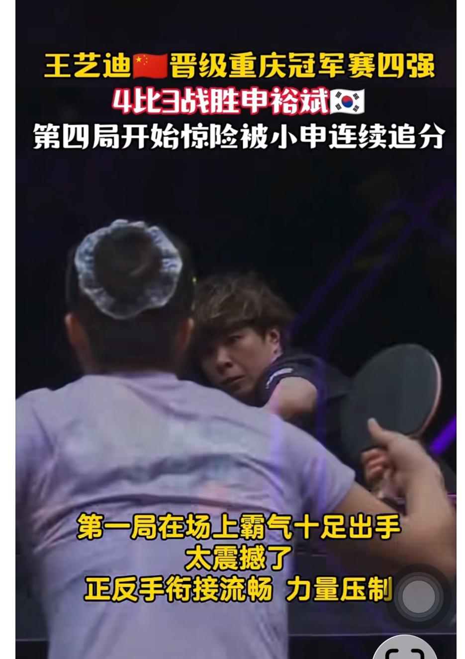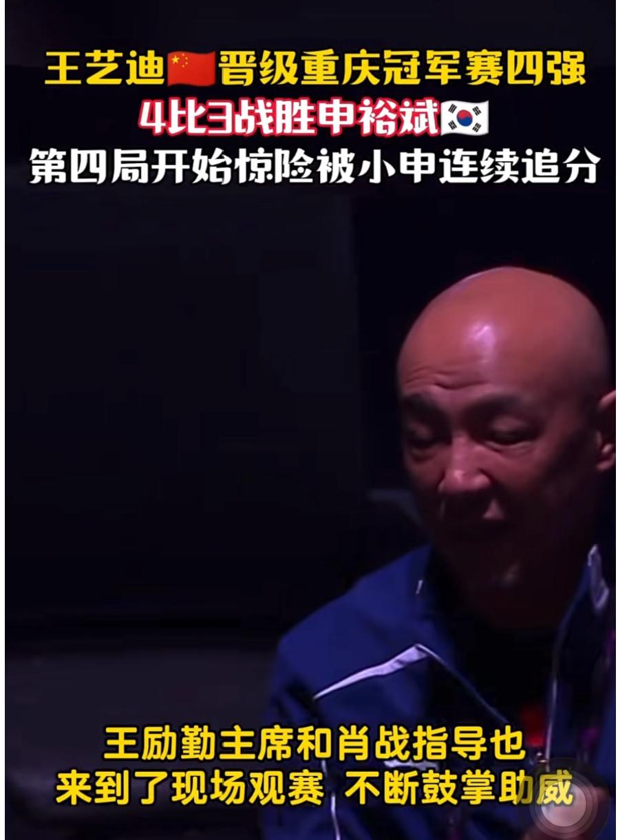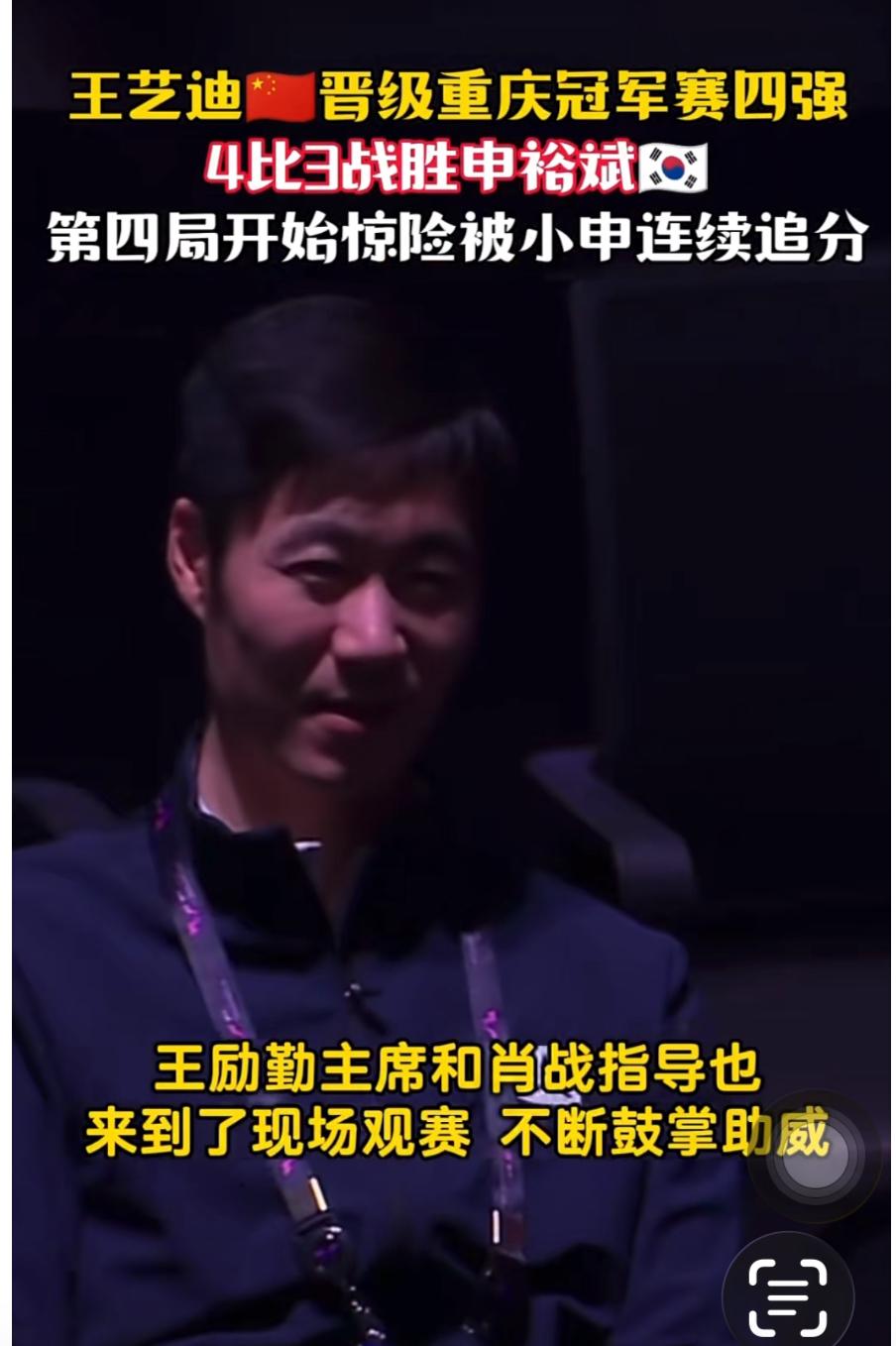 王励勤主席 肖战指导给王艺迪加油助威——大迪拒绝逆转4:3拿下申裕斌,晋级半决赛! 恭喜大迪晋级重庆冠军赛四强, 跌宕起伏,惊心动魄的比赛, 王艺迪在赛后采访中表示: “自己前三局发挥得不错, 4至6局走神了, 心情也不好, 第七局坚定信念, 拿下比赛! 下一场将面对孙颖莎或蒯曼, 她们都是顶尖高手, 队内比赛,压力较小, 希望自己发挥出自己的水平, 享受比赛乐趣吧!” 喜欢王艺迪, 人非常真诚, 幸亏大迪的身体素质好, 拼到决胜局, 越战越勇,霸气十足, 恭喜王艺迪晋级半决赛!