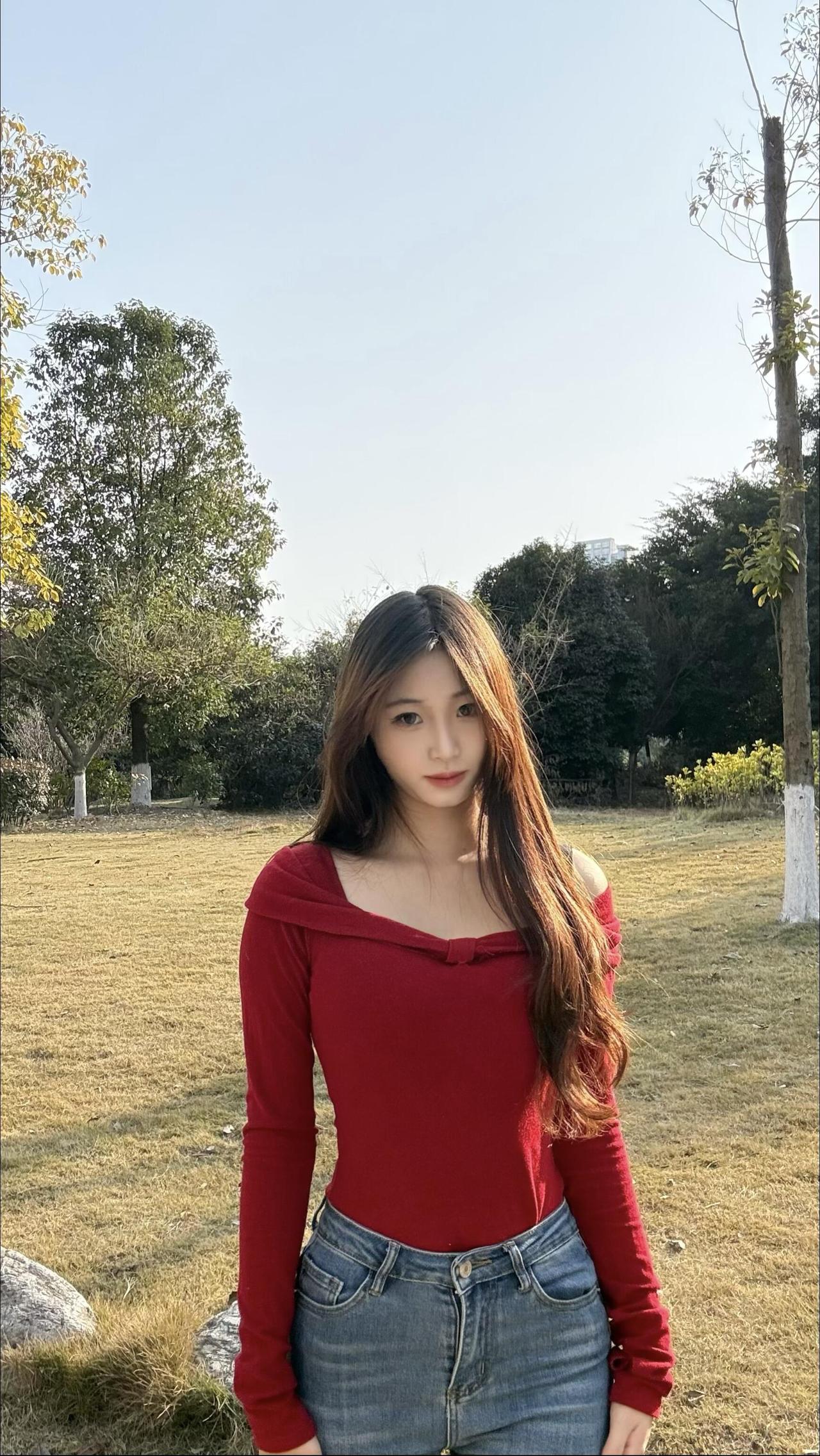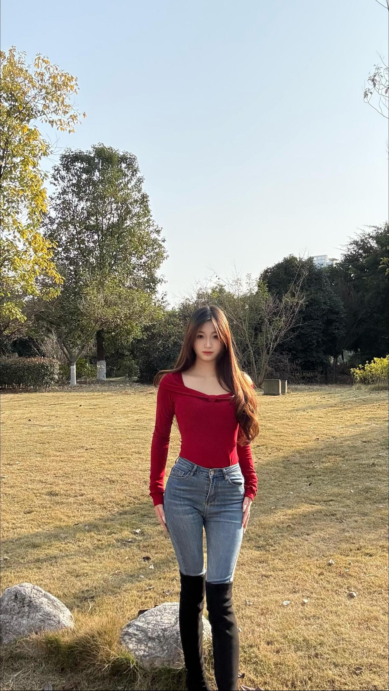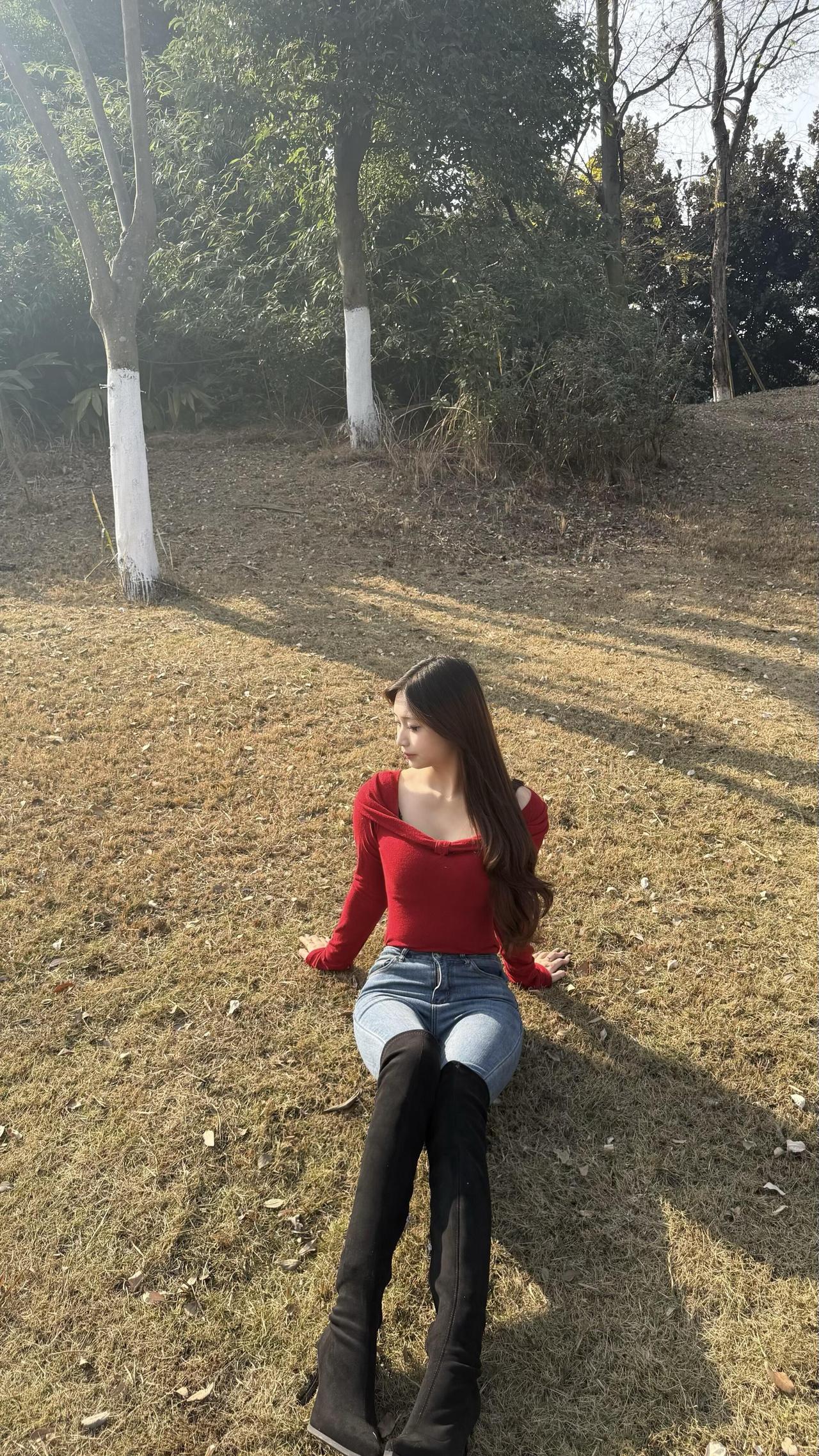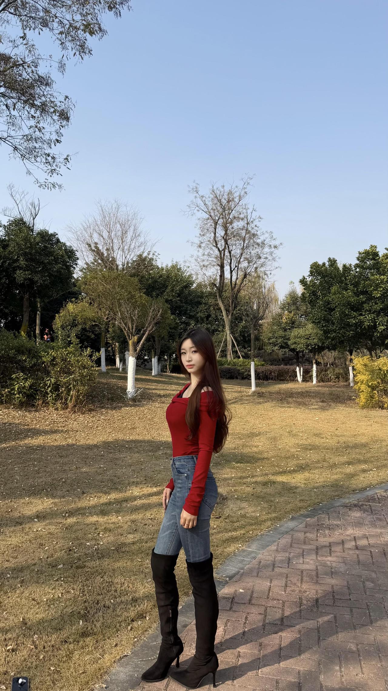 晴日的公园,连风都是暖的✨ 酒红针织软软糯糯,贴在身上温柔又舒服,搭配高腰牛仔和过膝靴,简单一身却很有精气神,慵懒里带着一点利落感。 找片草坪晒晒太阳,在石阶上安安静静待一会儿,不用刻意摆拍,也不用追赶节奏。 就这样慢慢享受好天气,自在松弛,随性又好看,整个人都被阳光烘得软软的,心情也跟着明亮起来。