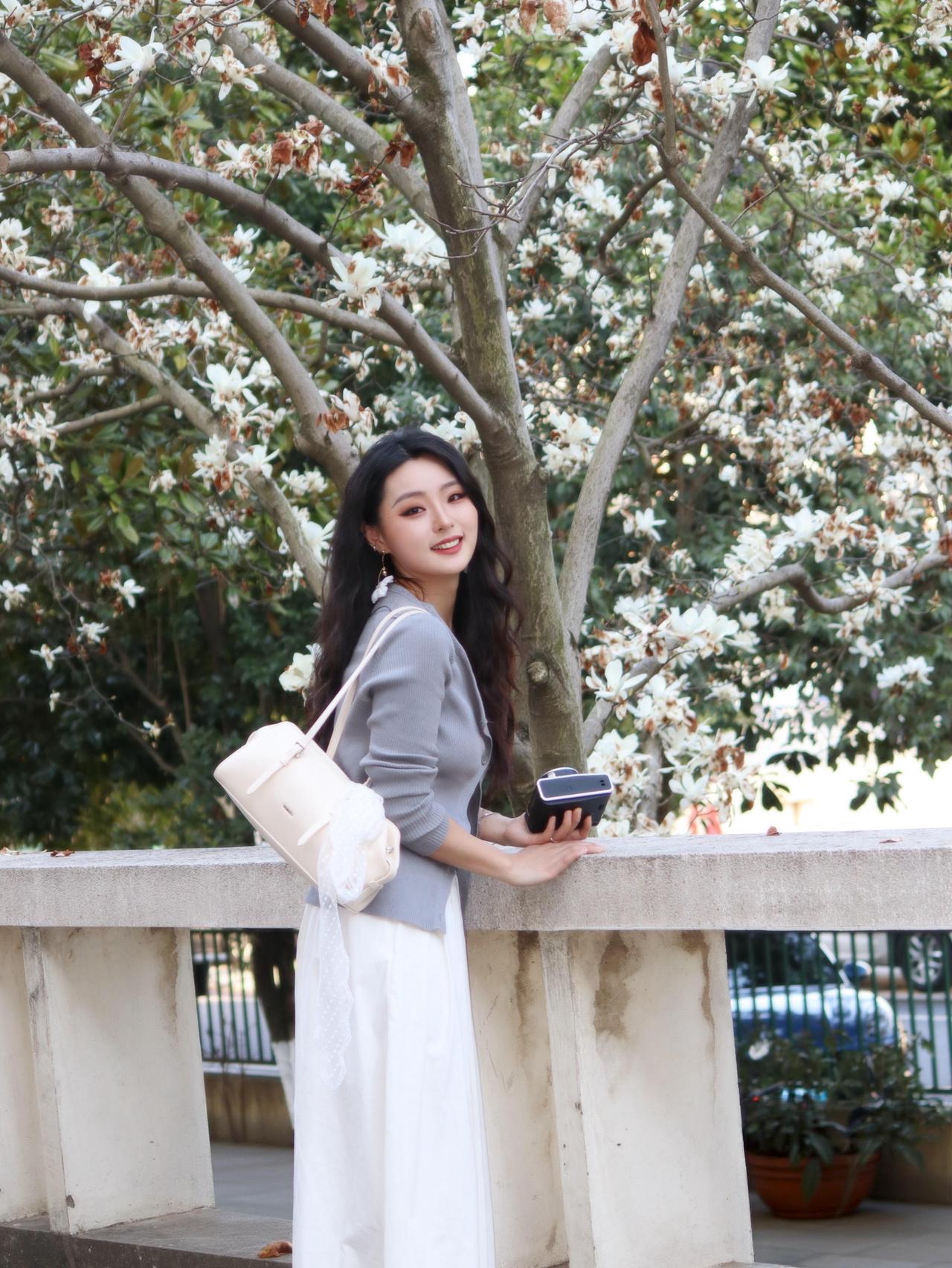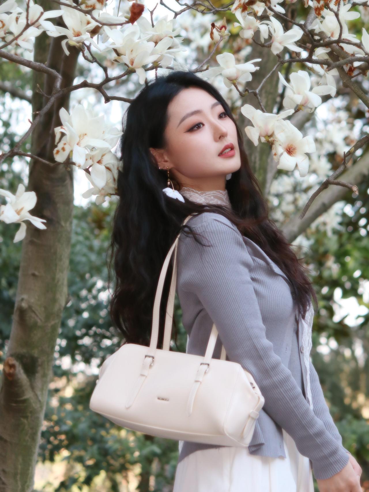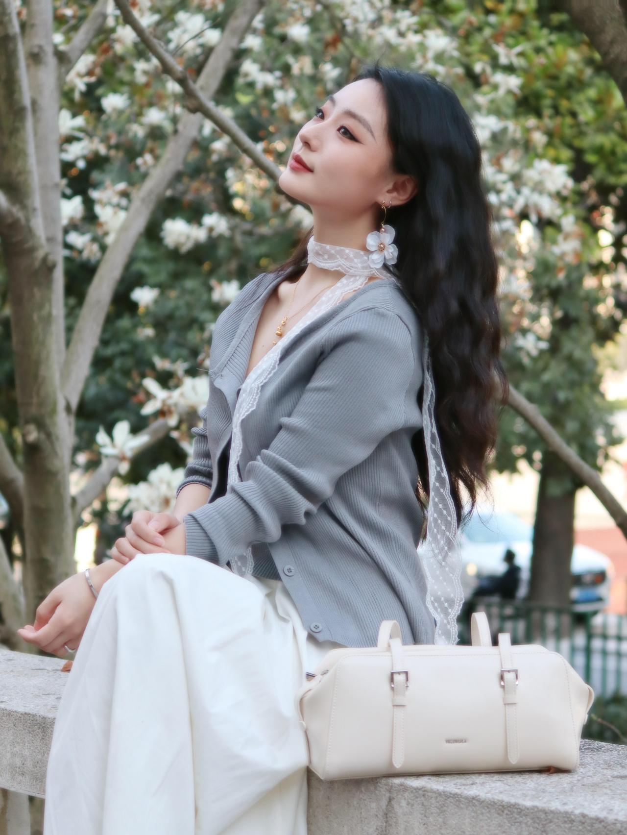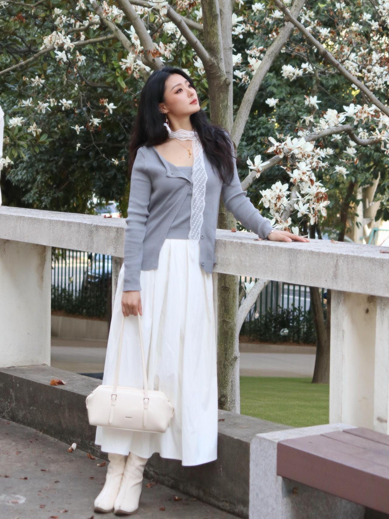 粉裸色斜肩上衣搭配纯白包臀裙,干净又克制,温柔却不甜腻。 阳光刚好落在走廊里