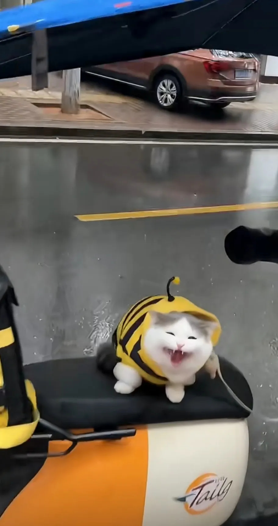 跟着送外卖的小猫咪,看见主人回来了,乐得牙齿都出来了