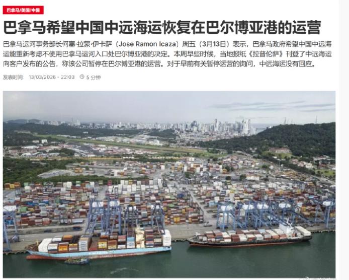 巴拿马向中远海运低头,恳请恢复运营巴尔博亚港,否则这损失就惨重了! 3月13号,巴拿马的运河事务部长伊卡萨,专门出来喊话了。他对着媒体镜头,那语气听起来有点急,甚至有点“恳求”的味儿,希望中国的中远海运集团能重新考虑一下,赶紧恢复在巴尔博亚港的运营。 这姿态,跟两个月前那可完全是两副面孔了。 当时巴拿马宣布,香港和记港口集团运营巴尔博亚港和克里斯托瓦尔港的合同无效。到了2月份,巴拿马更是直接动手,强行接管了这两个位于巴拿马运河两端的战略要地,连办公室都给搜查了,文件也收走了,那是相当地强硬。 这一通操作下来,谁都看得出来,这背后是去年年底美国那边施压的延续。巴拿马为此不惜撕毁合同,当时巴拿马总统穆利诺还嘴硬,说不知道中国会有什么反应,甚至觉得“什么都不会发生”。 既然你不讲契约精神,强行把我方企业赶走,那我也不陪你玩了。中远海运很快就发了个通知,从3月10号开始,暂停所有去往巴尔博亚港的航线服务,已经订好的舱位全取消,空箱子也不往那儿送了,直接改到大西洋一侧的科隆港去。 中远海运承接了整个巴拿马运河大约10%的航运业务。而且,这4%对于巴尔博亚港来说,那是不可替代的优质货源。更关键的是,整个巴拿马运河的收入占到了他们国家GDP的7%以上,给政府贡献了超过20%的财政收入。中远海运这一撤,不仅仅是撤走了那4%的箱子,更是给全球航运业释放了一个强烈信号:在这个港口,现在的营商环境已经不确定了,连原来的大客户都走了。 刀哥觉得,现在巴拿马的“恳请”,说白了就是疼了,怕了。他们害怕的不是4%的吞吐量,而是失去中方这个巨大的贸易伙伴和投资来源,害怕巴拿马运河在全球航运格局中被边缘化。毕竟,世界的路千条万条,不一定非要走巴拿马。但巴拿马的经济命脉,却实实在在地绑在这条运河上。
