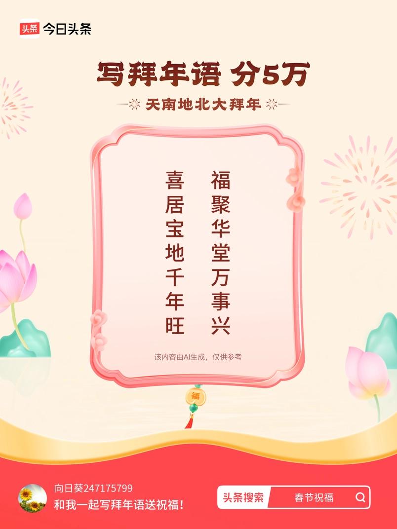 写拜年语送祝福新春拜年送祝福!我的祝福是:“喜居宝地千年旺,福聚华堂万事兴”!快来一起写祝福吧戳这里,一起领红包>