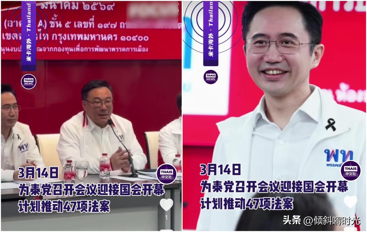 泰国消息 当地时间3月14日,以为泰党党魁朱拉攀,前总理他信外甥育查南为首的为泰