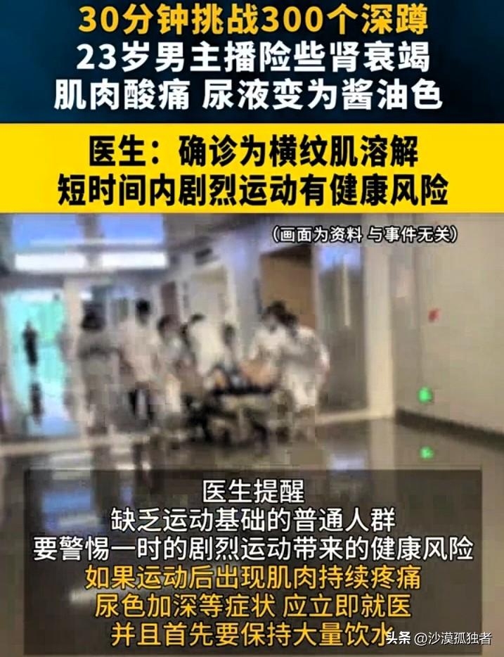 湖北武汉,一男子直播健身时,在半小时左右做了300个深蹲,做完后感觉腿部发酸,但他没在意,结果次日双腿剧痛无法行走,第三天还排出了酱油一样的尿液。 酱油色尿液、剧烈肌肉胀痛,这些看似罕见的症状,实则是身体发出的致命预警,武汉23岁小伙阳阳的经历,为每一位健身爱好者敲响了警钟。 阳阳是武汉一名直播从业者,日常会通过健身直播与观众互动,提升直播间的活跃度。 接诊的武汉市中心医院急诊科副主任医师彭欢,在详细询问病史后发现,阳阳的病症根源,正是此前一场毫无节制的深蹲挑战。 说白了,阳阳遭遇的不是普通的肌肉酸痛,而是医学上常说的横纹肌溶解症 。这病名听起来挺吓人,其实原理不难理解。咱们的肌肉细胞里藏着各种各样的物质,平时相安无事。 可一旦肌肉被逼到极限,比如像阳阳这样在半小时内猛做300个深蹲,细胞膜就可能撑不住破裂了。细胞里的肌红蛋白这些东西一股脑儿全跑进了血液里 。 这肌红蛋白对肾脏来说可不是什么好东西,它随着血液流到肾脏,就像一堆没经过处理的淤泥堵住了精密的下水道,严重的能把整个排泄系统搞垮,甚至引发急性肾衰竭 。 很多人健身有个误区,觉得练完必须“酸”才算练到位,不酸就是白练了。实际上,正常的酸痛和肌肉溶解的疼痛完全是两码事。阳阳刚开始觉得腿发酸,可能还觉得是效果来了,谁能想到第二天会痛到走不了路?更吓人的是那个酱油色的尿,那是肌肉里的肌红蛋白排不出去,直接跟着尿液排出来的直观证据 。这就等于身体在喊救命了,再硬扛下去,肾脏可能就真的顶不住了。 现在这年头,不管是在直播间里还是朋友圈里,大家都或多或少有点“健身焦虑”或者“身材内卷”。好像不在健身房把自己练趴下,就不够努力。 特别是像阳阳这种职业需要,为了直播效果,更容易被弹幕里的“再来一个”、“这就不行了?”给架起来,咬着牙也要上。可身体这东西最诚实,它有自己的极限,不遵守客观规律,惩罚立刻就来。这种突击式的狂热运动,平时不怎么动,一动就往死里动,受伤风险最高 。 我觉得这事给所有人都提了个醒,运动是给自己练的,不是给别人看的。别管直播间里多少人给你点赞叫好,腿长自己身上,难受不难受只有自己知道。 循序渐进、量力而行这种老生常谈的话,往往都是出事之后才觉得是真理。运动前热身,运动后拉伸,过程中少量多次地补水和电解质,感觉不对劲就立刻停下来 。真要是发现尿液颜色变深、肌肉疼得不对劲,千万别拖,赶紧往医院跑,这病拖不起 。 各位读者你们怎么看?欢迎在评论区讨论。 信息来源:武汉市中心医院、湘南学院附属医院、湖北省第三人民医院、湖南省儿童医院、默沙东诊疗手册、科普中国