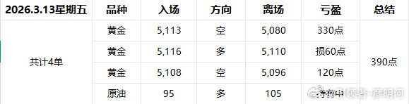 2026.3.13星期五操作复盘;周五行情于我们所预测那边,行情方面多日不上5200多头信心被打击黄金开始继续回落!晚间随着美元指数和原油的拉伸黄金加速下落接近5000关口,我们在短线上的表现依旧亮眼同时埋伏的原油中线单子也走上正轨!共计给到4单,3次短线一次中线,中线持有短线拿下390点!