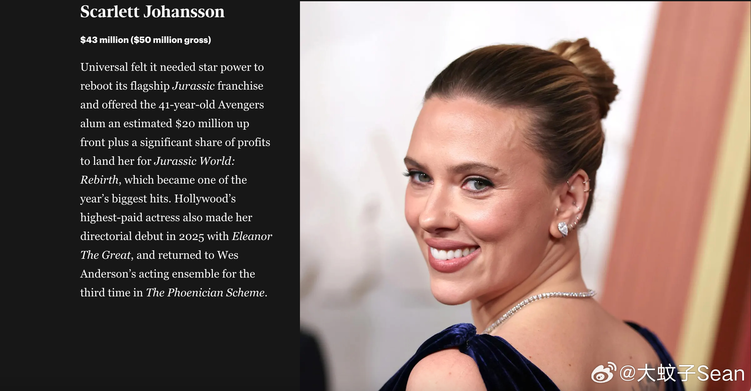 福布斯公布2025年全球片酬最高演员排行榜,Scarlett Johansson斯嘉丽约翰逊以4300万美元排在第四位,斯嘉丽去年不仅主演了全球票房超八亿美金的《侏罗纪世界:重生》,还执导了自己的首部导演作品《了不起的埃莉诺》,她也是榜单上片酬最高的女演员