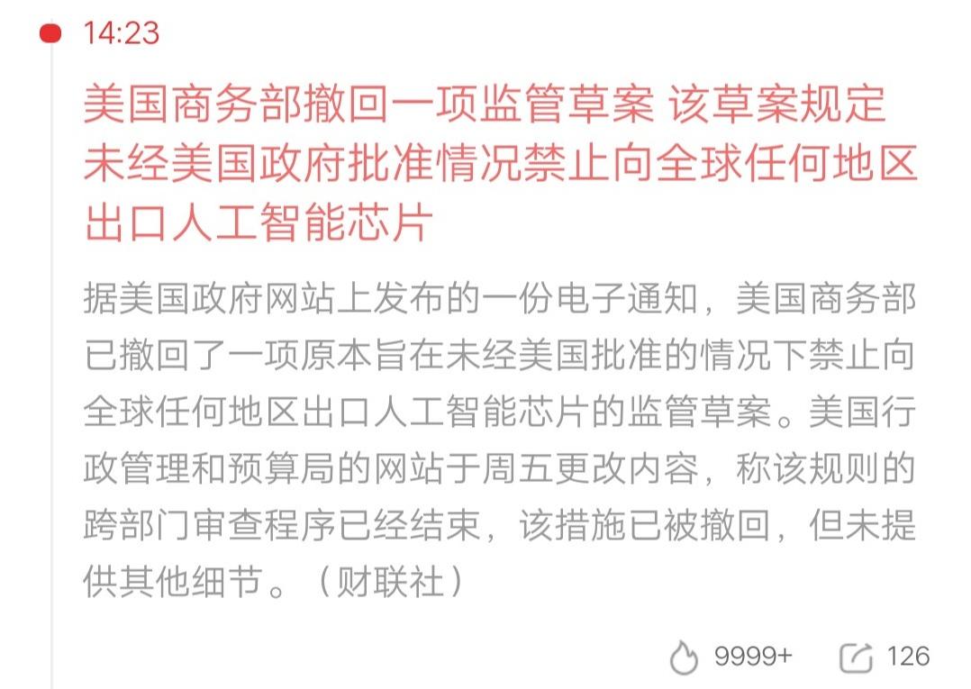 人工智能芯片的竞争格局,要大变天了。美国商务部撤回一项监管草案,该草案规定未经美国政府批准情况,禁止向全球任何地区出口人工智能芯片。 换句话说,美股科技巨头卖芯片,不需要经过美国政府了,是纯粹的商业行为了。此前就是因为特朗普禁止H200芯片对华出口,才导致英伟达失去中国市场。 问题来了,人家政府不干预了,咱们要不要跟。如果咱们也允许企业,购买美股科技巨头的芯片,对国产芯片会造成不小的冲击。 寒武纪,摩尔线程,沐曦股份,他们是国产AI芯片的标杆企业,业绩是受益于国产替代逻辑的。 大家怎么看呢?