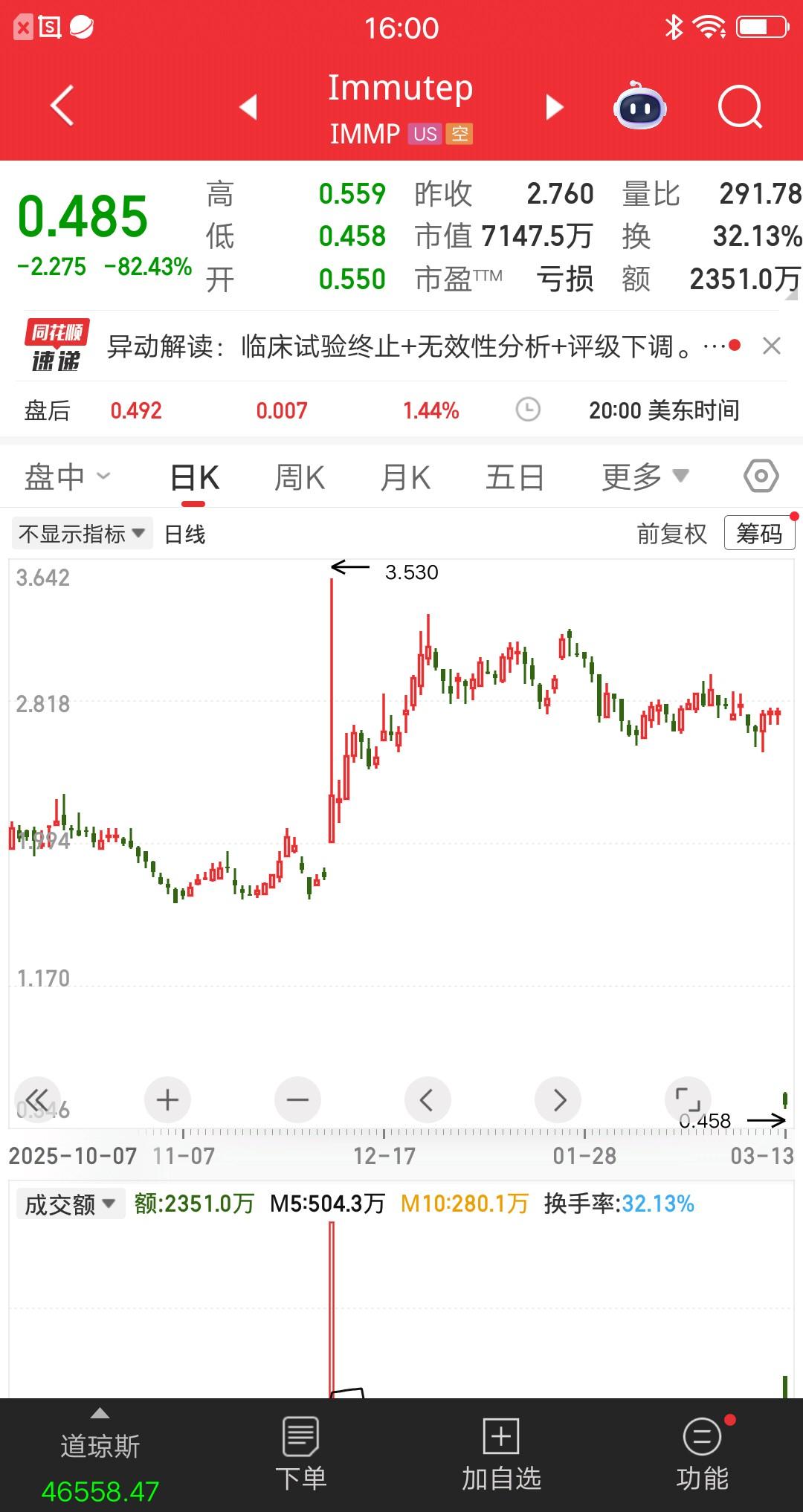 美股今天最惨的票诞生了,破产大阴线从天而降,根本躲不掉呀。该票开盘就是地狱,跌幅超过八成,恐怖如斯。这是什么概念呢?相当于大A主板的票,连续16个跌停板,就问你们惨不惨? 该票是一只仙股,昨日收盘价2.755美元,现在只剩下0.485美元。持有的人打开账户一看,天塌了,一万本金还有不到两千。 就算是提前设置卖出价位,也很难躲得掉,因为买盘不够。 该票警示我们散户,大A千万不能T加0,涨跌幅限制千万不能取消。我可不想一夜归零,天台我更不想去。