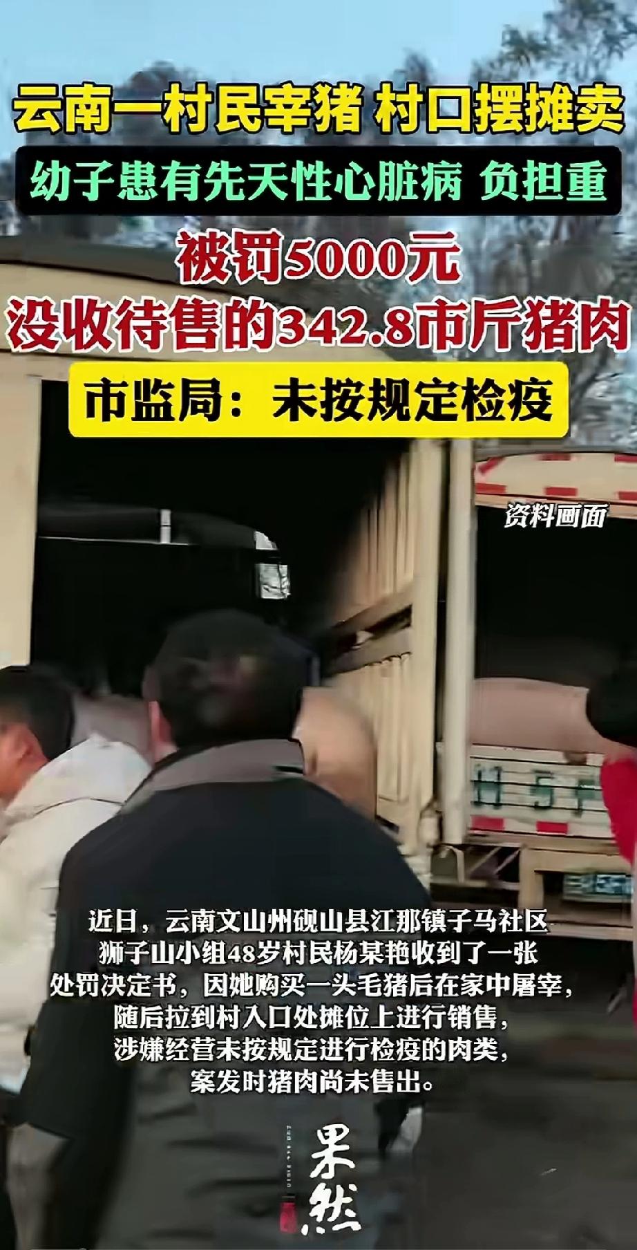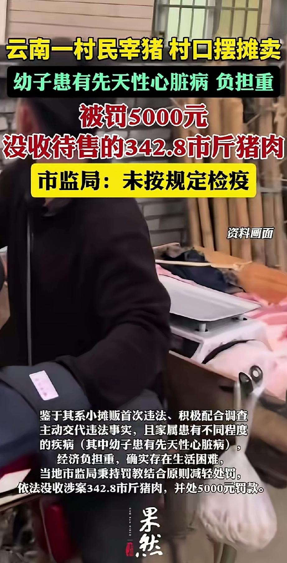 对于近日云南某地市监局处罚村民私屠未检疫猪一事,市监部门做的很对,食品安全关乎每一个的身体健康,未经检疫合格上市的猪肉有可能带有疾病,危害消费者的健康,不能因为家里有困难就可不遵纪守法。市监局对其只没收未售完的342斤猪肉和处罚4000元,也显示出对生活困难家庭网开一面,体现出严格执法中的温情。