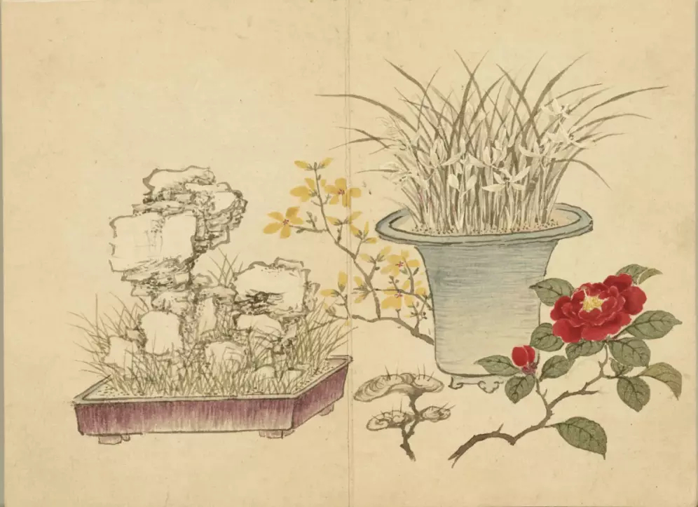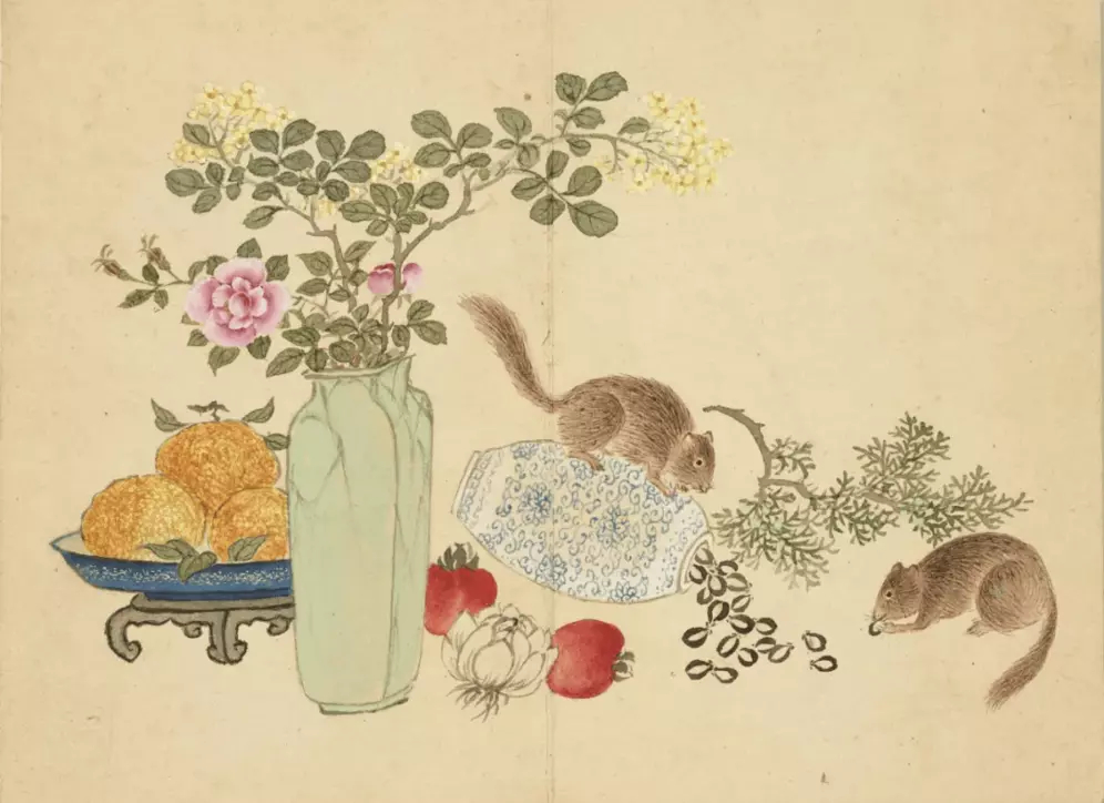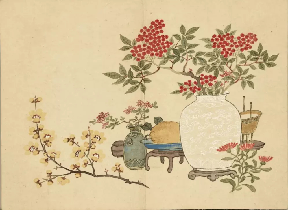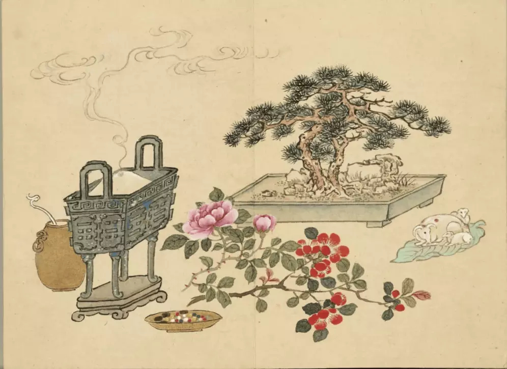 清 董诰 清供图册。董诰(1740-1818年),字西京,号蔗林、柘林,浙江富阳人。乾隆二十八年( 1763 )进士,官大学士。工古文诗词,书法、山水画禀承家学,与其父董邦达有“大、小董”之称。这就是中国风遇见艺术