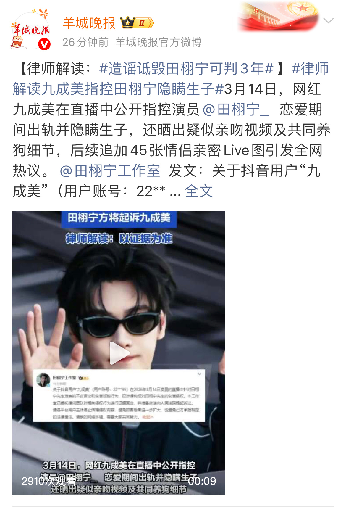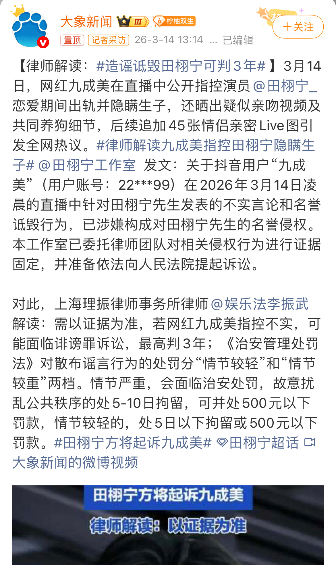 媒体发文:律师相关解读造谣诋毁田栩宁可判3年