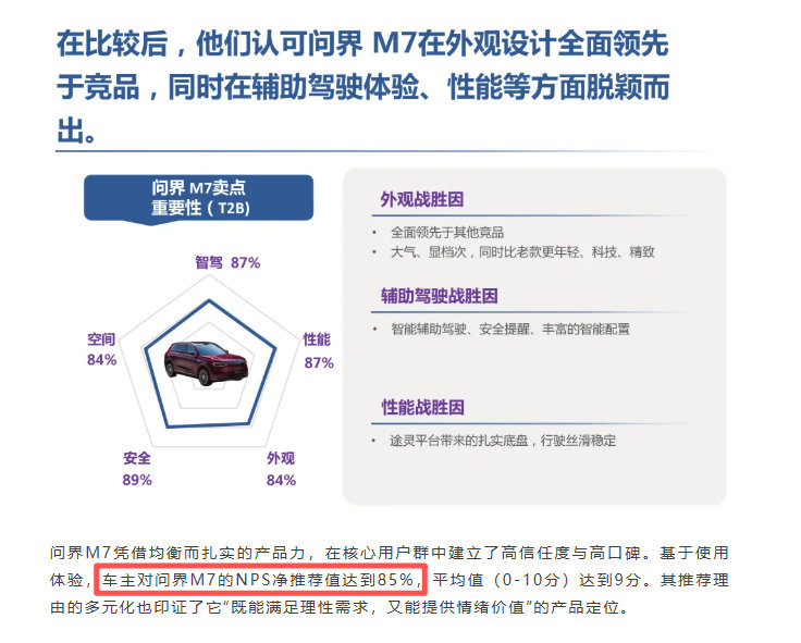 尼尔森报告称问界M7净推荐值达85%从数据就能看出来,问界M7是真的受欢迎。85%净推荐值、超43万交付量,车主多是注重生活品质的家庭用户。大家愿意推荐,源于日常使用中的踏实感,智能配置实用,空间舒适,安全有保障。不刻意营销,靠真实体验积累口碑,这样的车型能出圈,也体现出当下消费者更看重实际用车感受。近9成车主愿意主动推荐问界M7