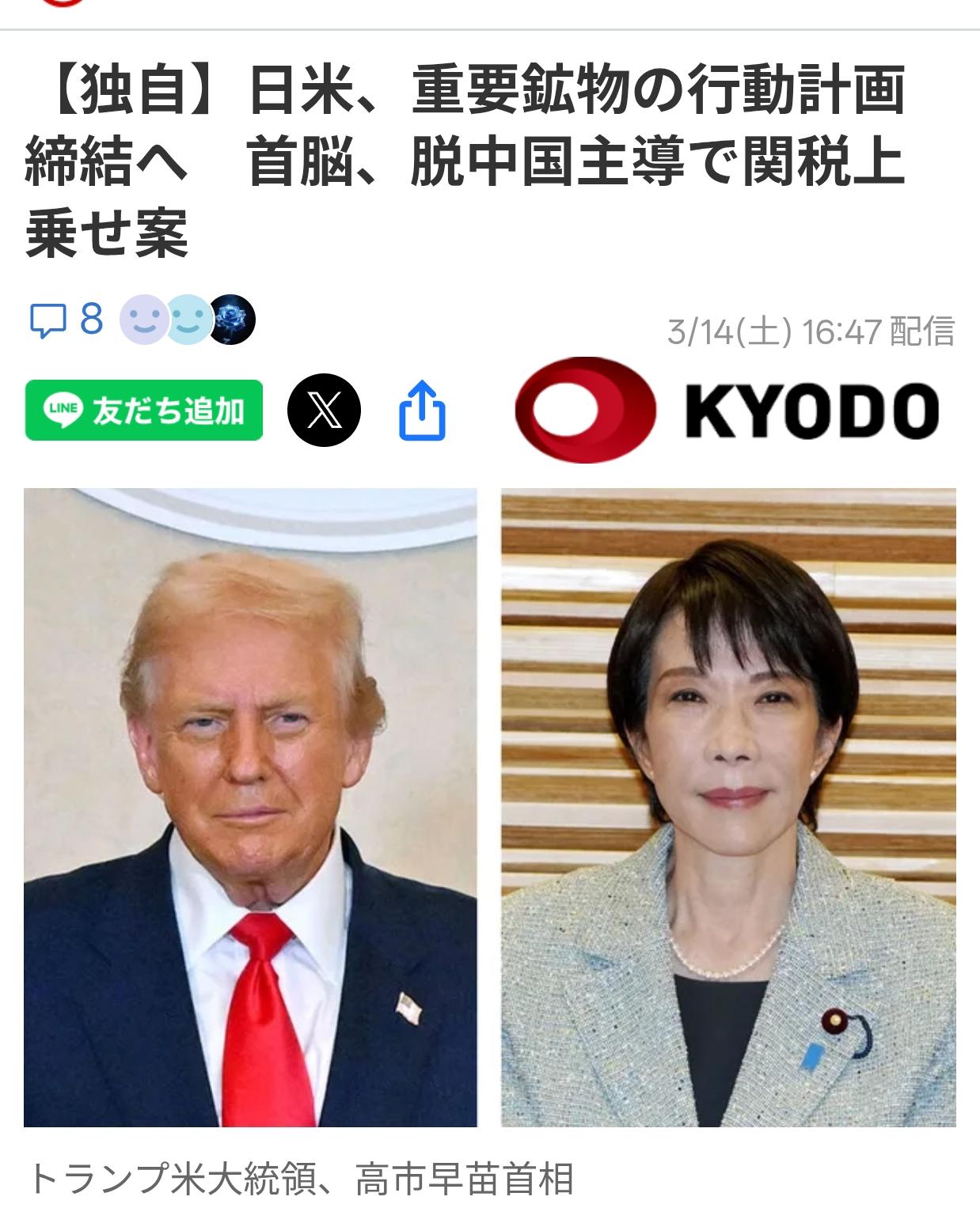 抱团取暖?美日想重构矿产供应链 据日本《共同通信社》3月14日报道:即将在19日举行的高市早苗与特朗普的首脑峰会上,日本和美国政府决定制定一项扩大关键矿产采购的贸易协议行动计划。 其中包括如何对应“中国稀土出口管制带来的经济胁迫”,还要对中国产重要矿产增加关税。 该贸易协定旨在“七国集团和意愿国家”框架内实现,由日本和美国主导。 行动计划将具体规定政策措施,以实现采购来源的多元化。 通过加征关税防止对中国关键矿产的过度依赖。同时通过补贴政策鼓励在海外进行投资和产能扩展。 中国企业在劳动力和环保法规有利的背景下,形成价格优势是需要面对的问题。 中国约占稀土产量的70%,而炼制稀土的比例则超过90%。 作为应对措施,七国集团正急于加强关键矿产的供应网络建设。 美国贸易代表处(USTR)主导了与澳大利亚及其他相关国家的贸易协定构想。 爆料