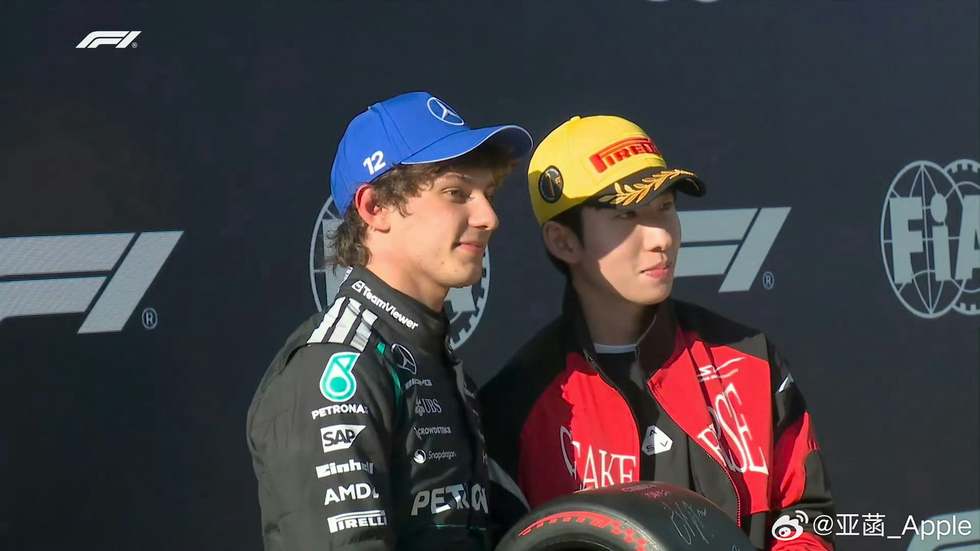 林孝埈为安东内利颁小轮胎 当冰场上的先锋遇上赛道上的极速!中国速滑运动员林孝埈为安东内利颁发杆位小轮胎 两位都非常优秀且帅气