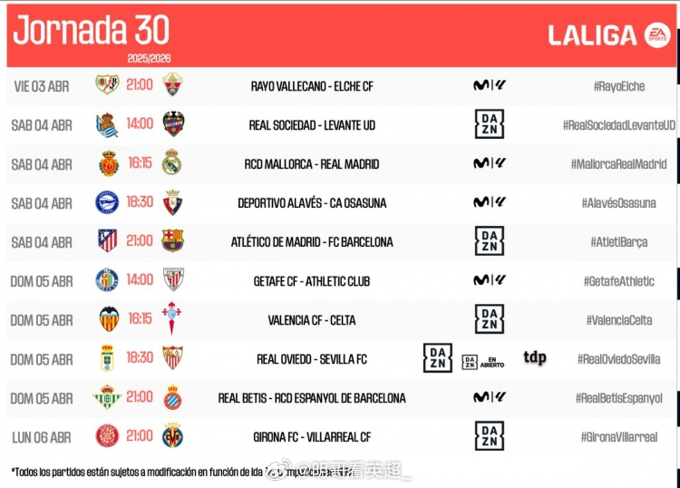 西甲第30轮时间:巴列卡诺vs埃尔切:4月4日03:00皇家社会vs莱万特:4月