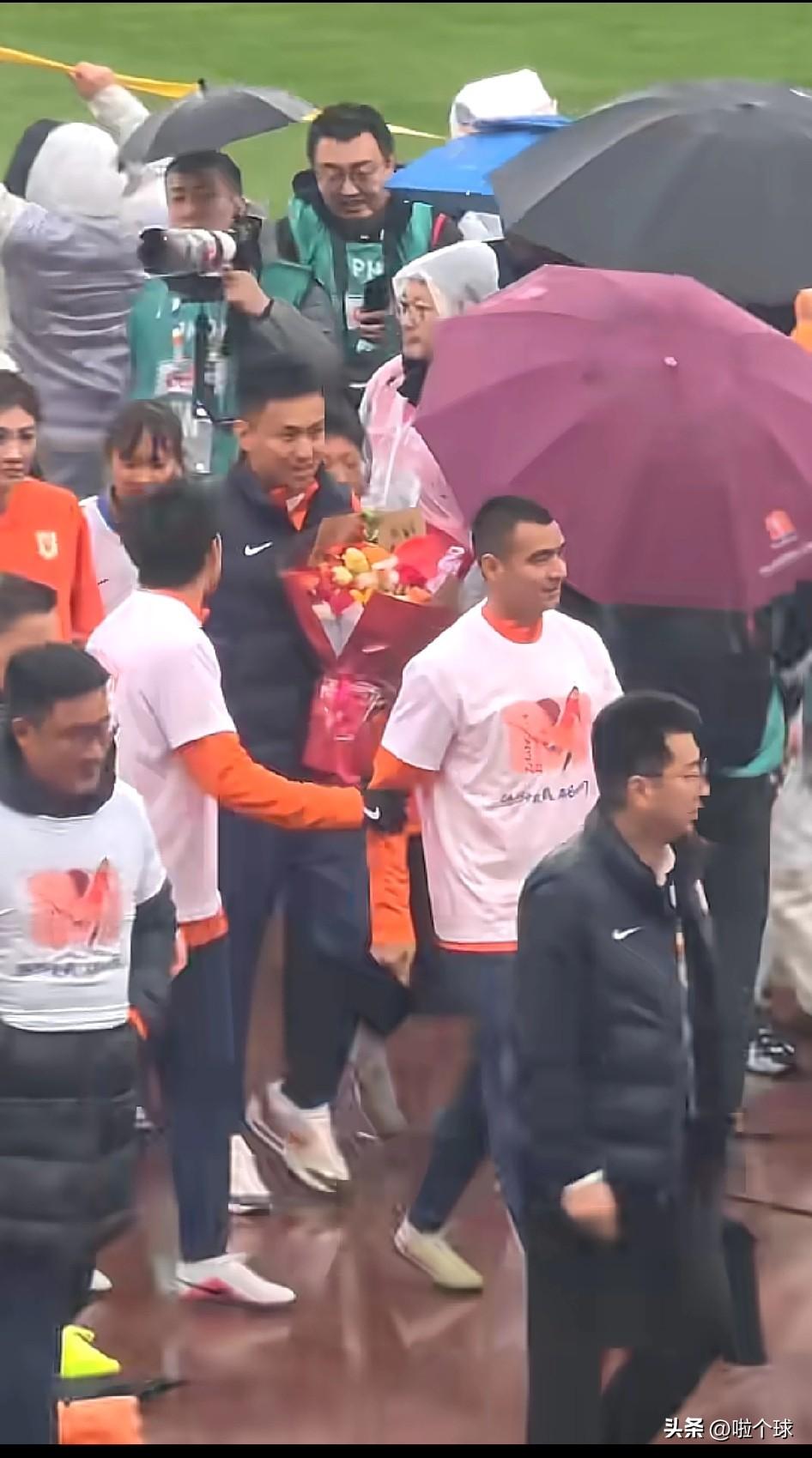 京鲁大战前的温情一幕 虽然天空下着淅淅沥沥的小雨,但依然无法阻挡京鲁大战的魅力! 但更让球你关注的除了比赛的本身,还有伴随着鲁能的功勋球员,张弛的退役自仪式! 虽然过程虽然简单,但依然体现了鲁能泰山的人情味,39岁的张弛退役了,作为老球迷有些伤感,但又不得不说这是职业球员的最终宿命? 一人一橙,一路顺风!