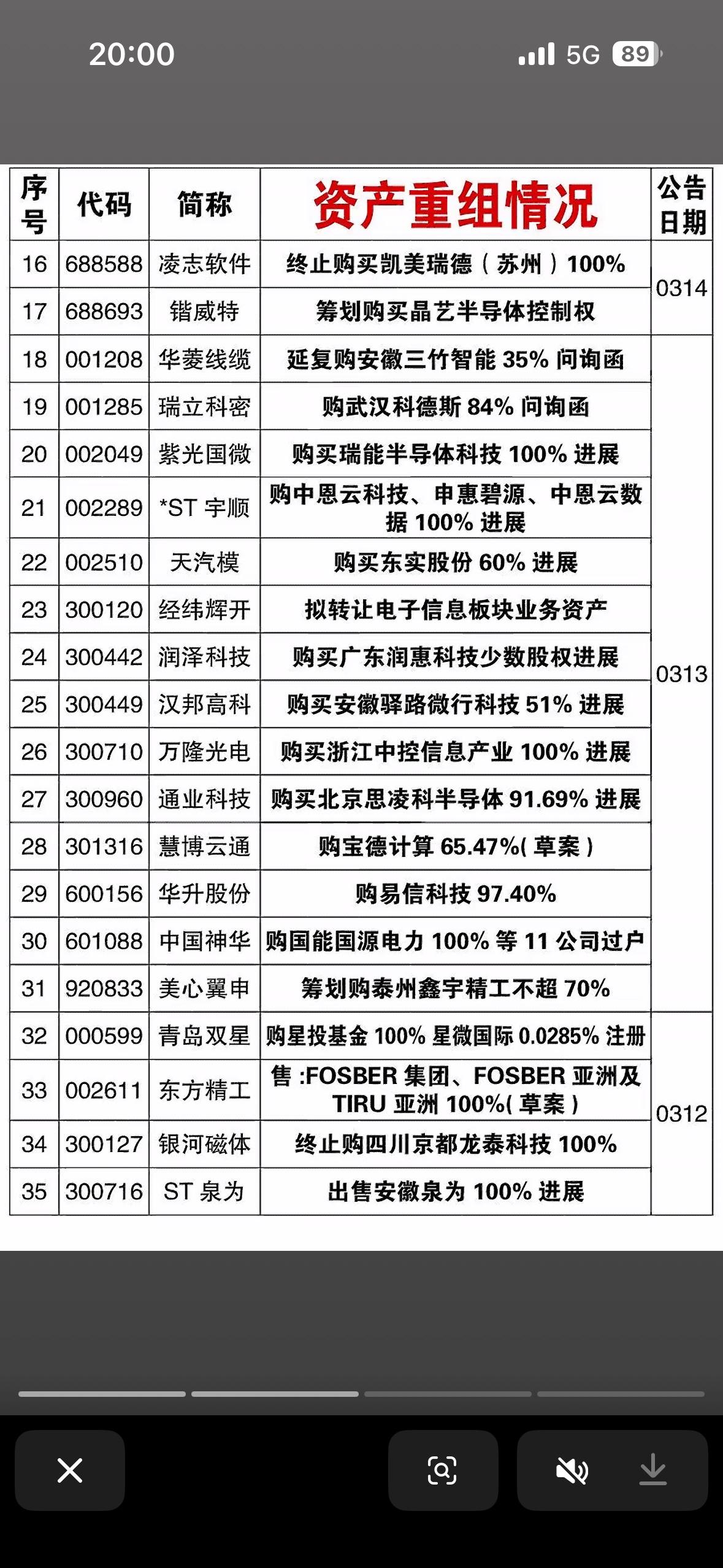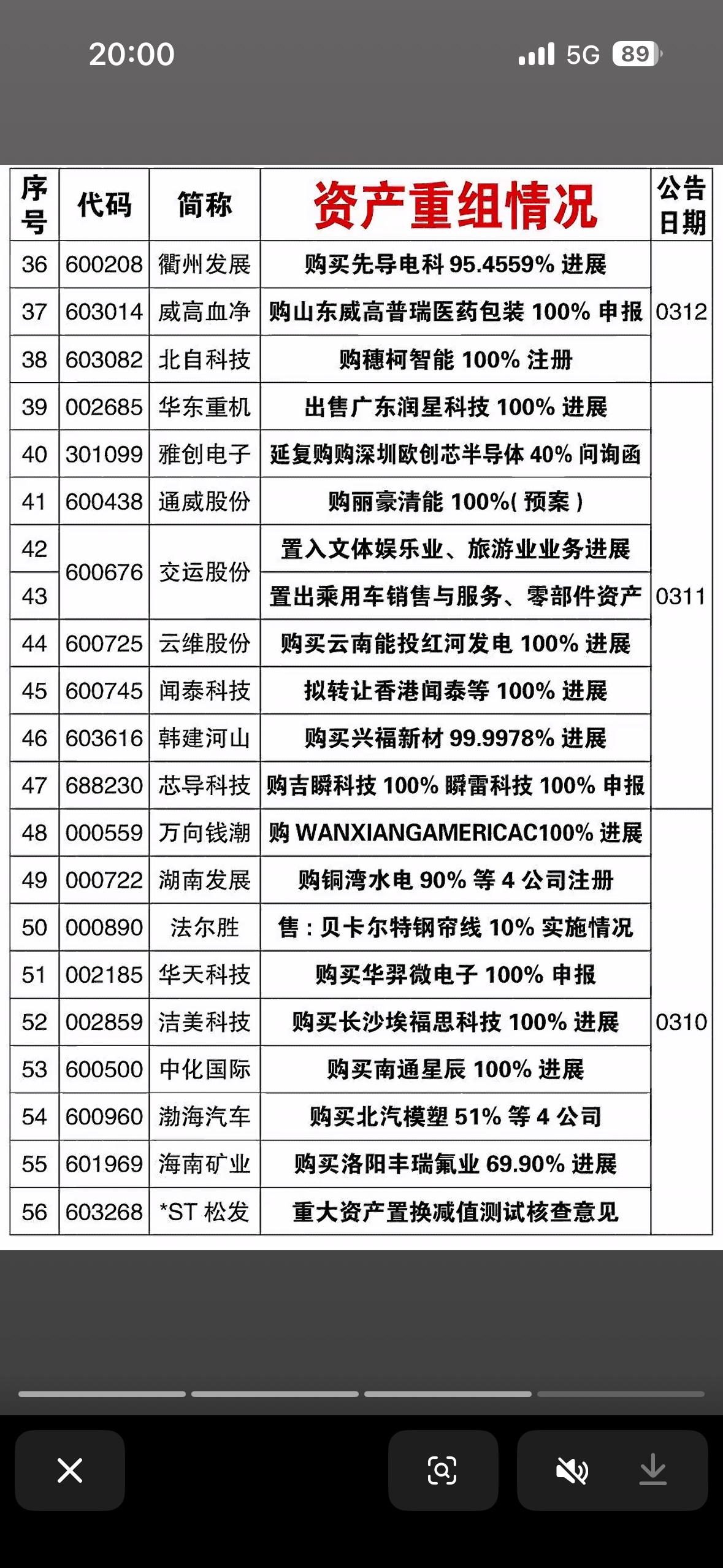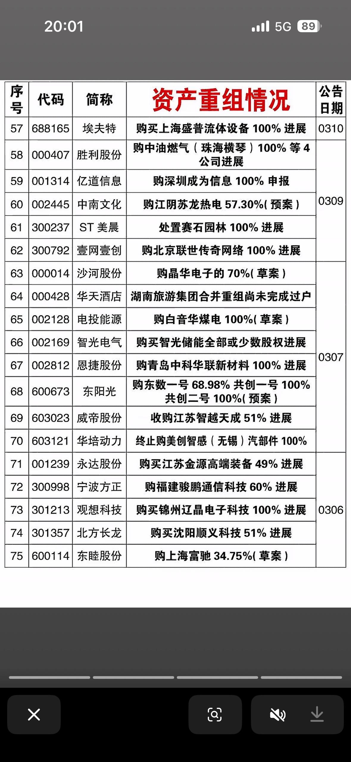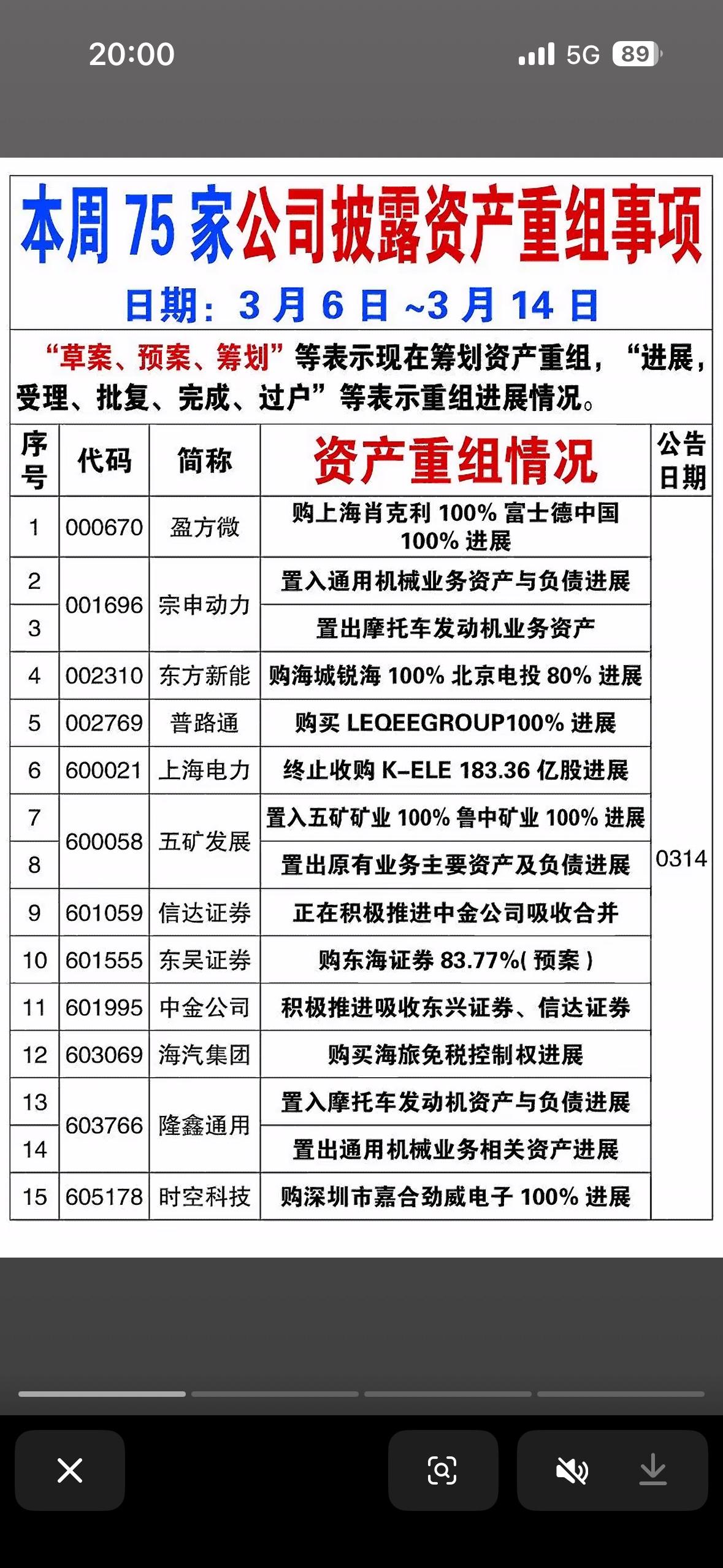 3月14日本周六有75家公司披露资产重组事项。 这让A股市场的并购重组更热闹了。截至周五收盘,中南文化拟购江阴苏龙热电57.3%股权,一字涨停晋级5连板;法尔胜拟出售贝卡尔特钢帘线10%股权,两连板。还有恒天海龙、康达新材等多家公司因并购重组相关事项涨停。 本周披露并购重组进展的A股公司有16家,像亨通股份拟2.74亿收购澳龙生物40%股权,完善生物科技领域布局。此前3月4日也有多家公司发布资产重组等公告,如兴业银锡出售股权获1.2亿首期款,德力股份海外设厂等。资产重组往往影响公司发展,值得持续关注。