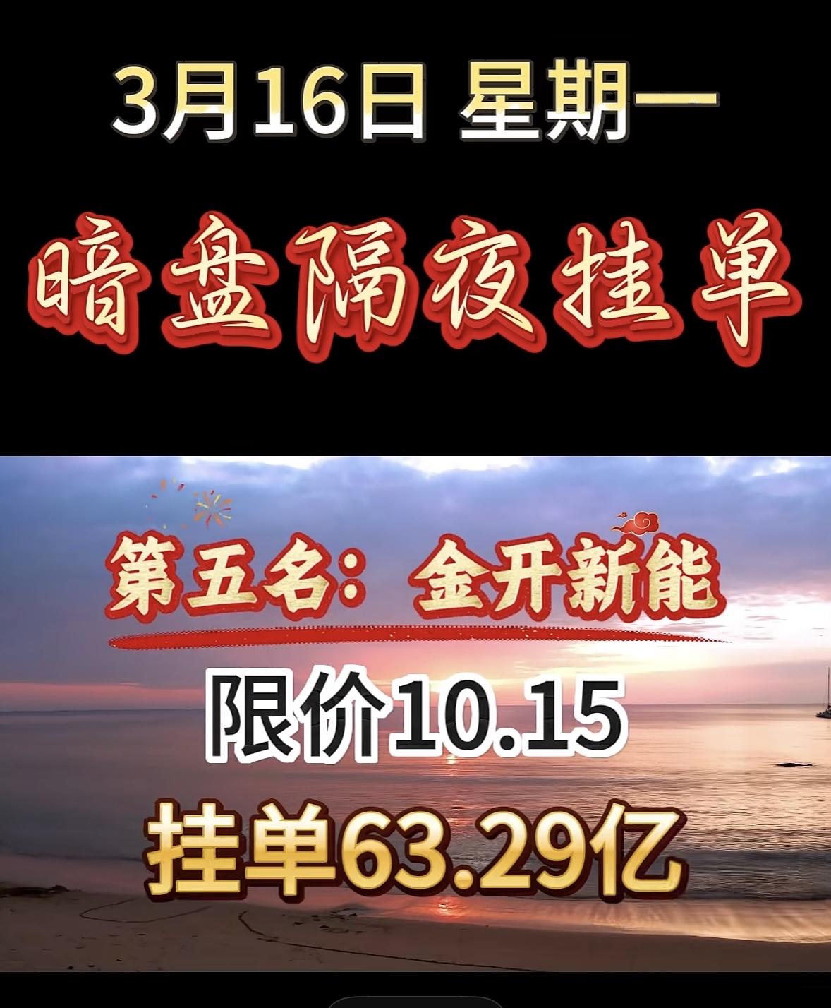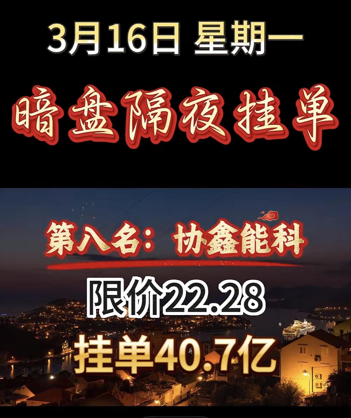 3月16日暗盘隔夜挂单个股揭晓 3月16号周一,协鑫能科这暗盘隔夜挂单可太猛了!限价22.28,挂单金额高达40.7亿。这么大的手笔,感觉背后肯定有不少故事。这是有大资金看好它后续的走势,提前布局,还是另有隐情呢?在股票市场里,暗盘隔夜挂单就像是一场悄咪咪的较量,很多时候普通散户都摸不着头脑。这么巨额的挂单,说不定会对协鑫能科接下来的股价产生不小的影响,是涨是跌,还真让人期待啊。